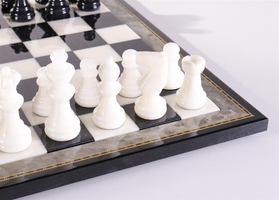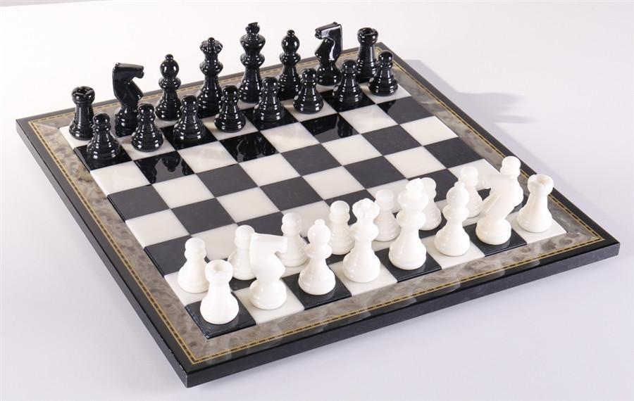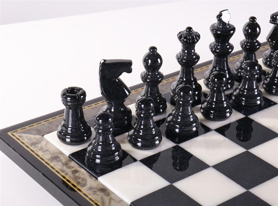 This set features a nice translucent black and white set of alabaster chess pieces on a matching board, a 3 inch king and felted bases on each of the chess pieces. These chess sets will catch the light like no other, and catch the eye like an impressive chess set should. With this beautiful chess set you pay for impressive quality all the way from Italy.