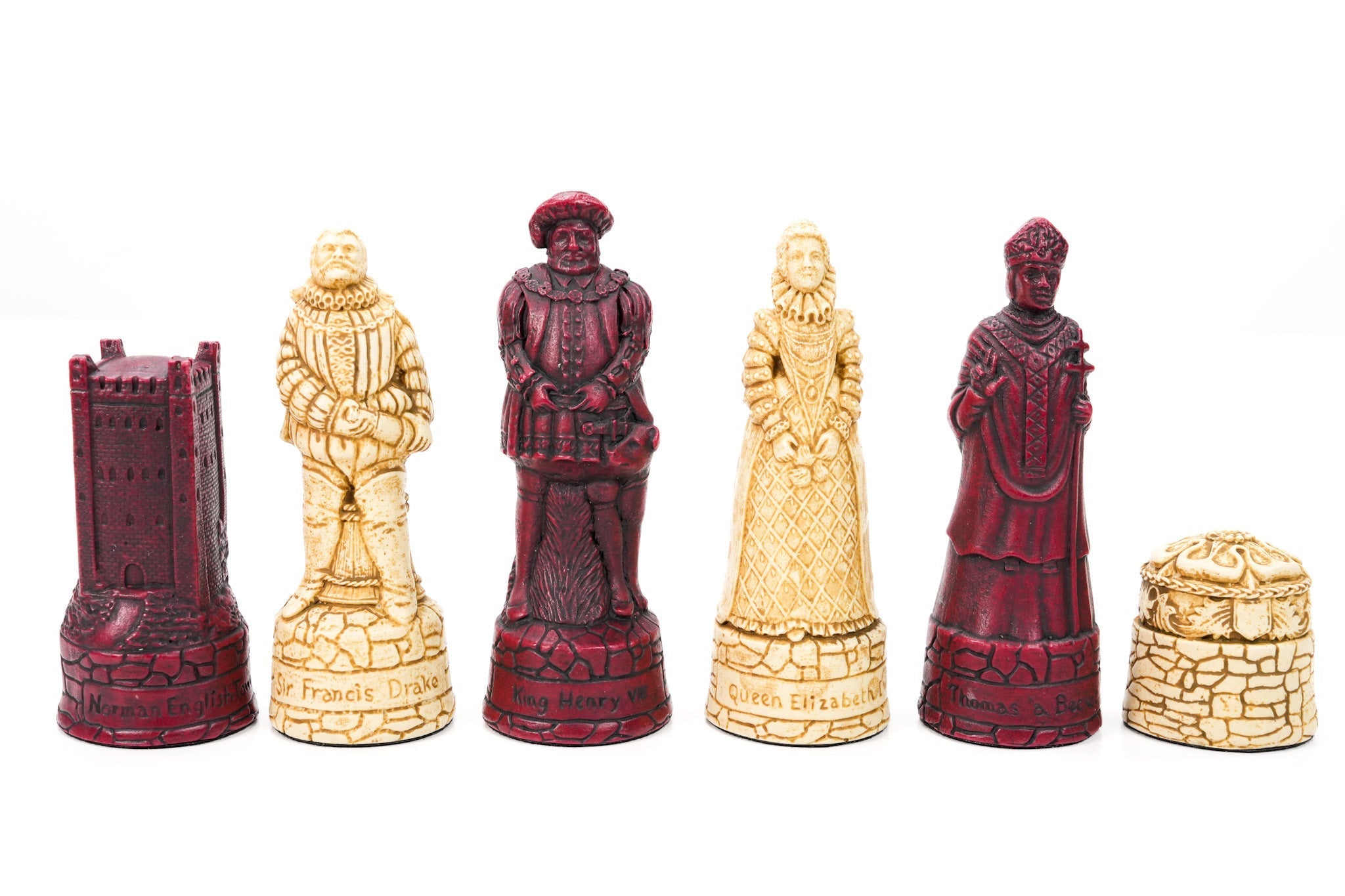 Utilizing a careful process, this range of chess sets are stained in Cardinal (a contemporary red) and Russet (a contemporary brown). It’s then further stained to add an antique effect. This results in an aged beautiful set that is eye catching and really stands out. They are well weighted with an improved ratio of crushed marble and resin, and then finished with a felt underlay.