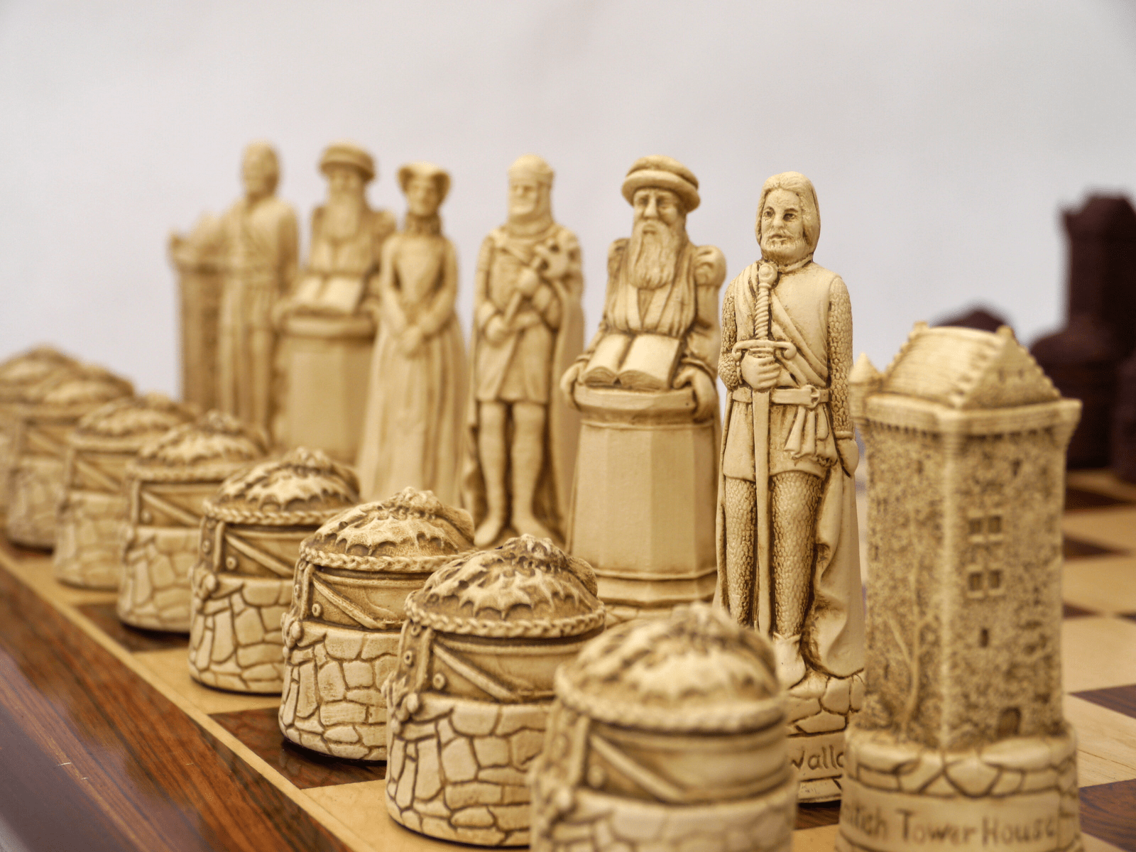 The rich and varied history of Scotland has been captured majestically in this beautiful chess set by Berkeley Chess celebrating Scottish heritage. Many of the key characters and symbols have been included as follows: