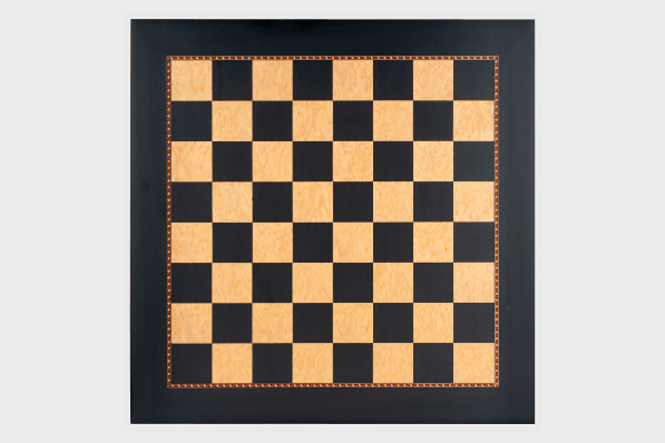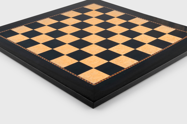 Made in Spain, the board showcases a beautiful design, with light Ash root and dyed poplar veneer, accentuated by an interior border parkay inlay. Measuring 19.6" square (500 mm) with 2" squares (50 mm), it features dark squares and border crafted from black dyed poplar, and light squares made of Ash root. The board's matte finish and parkay inlay enhances its sophistication. For anyone who was captivated by the Netflix Series, this board is a reminder of the heights one can achieve when they dare to pursue their dreams.