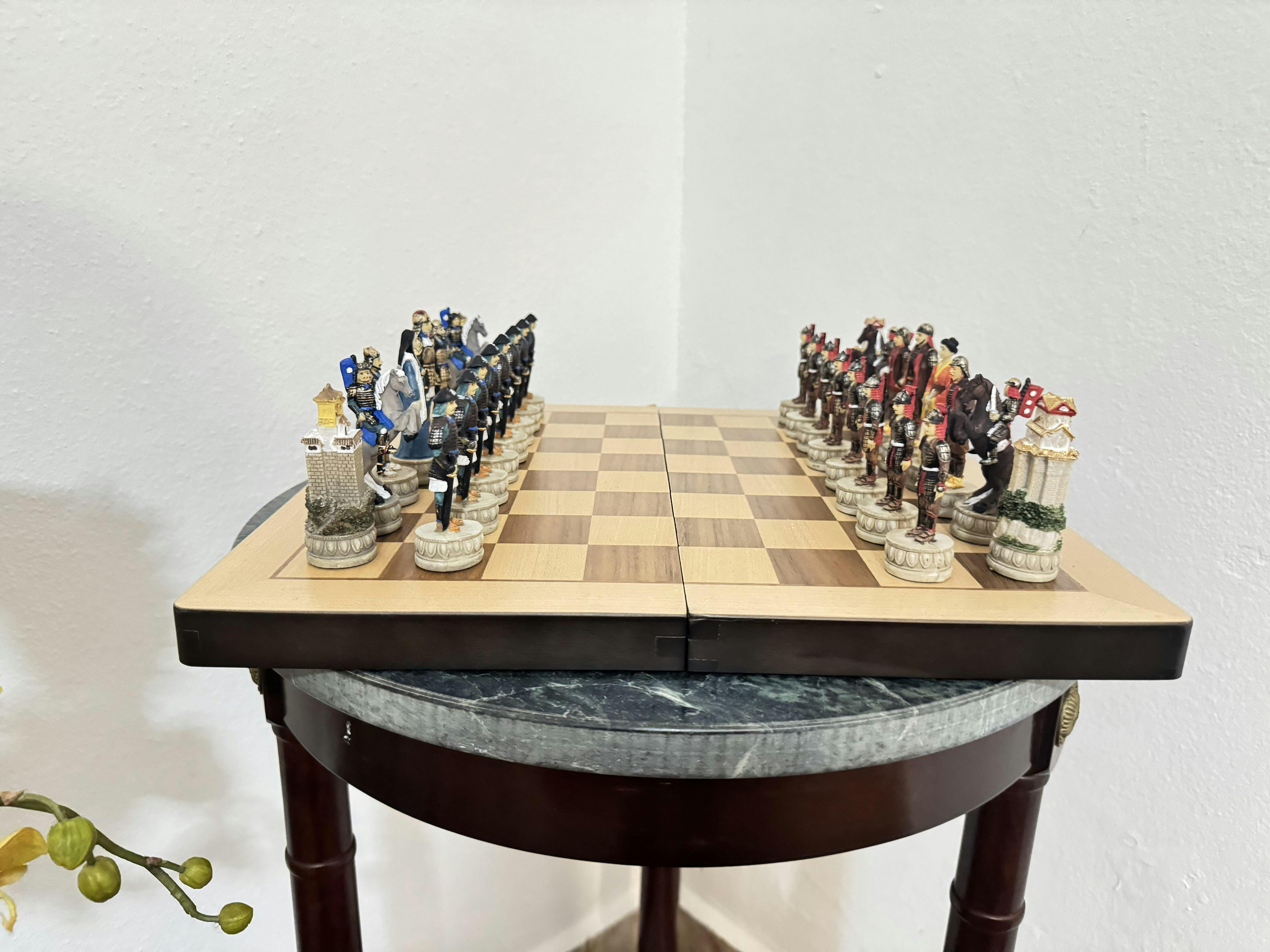 Test your skills, with a Samurai themed battle, and see if you have the wits to defeat the most famous warriors of Japan! These finely made chess sets are made of poly-resin. Each piece is hand-painted using long lasting, lead-free paint. These pieces are not recommended for children below 10 years of age since they will break if dropped or played with roughly.