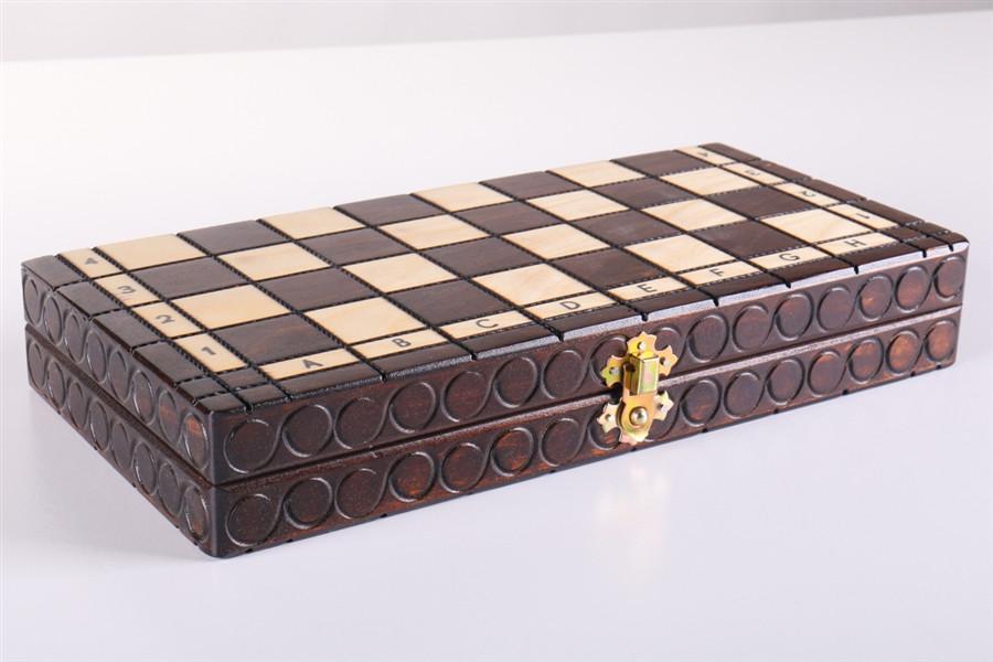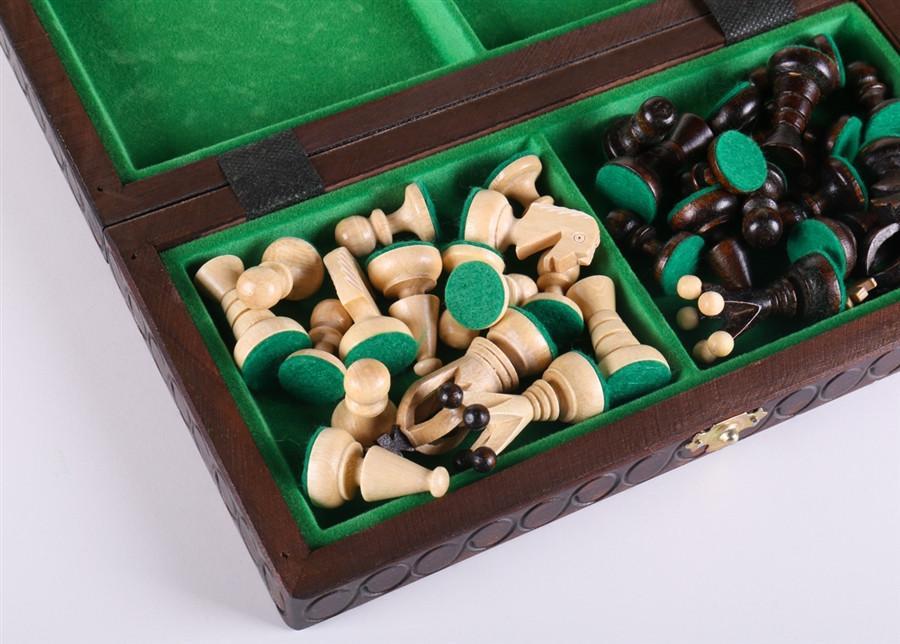 A lighthearted, lightweight, decorative chess set, straying from standard Staunton style, perfect for home. Etched rank and file coordinates helps beginning players and reassures forgetful experts. When done, swipe a hand-full of pieces inside the folded box, and clasp it close. Board made of beech wood and pieces are made of sycamore wood with felt bases keep surface scratch free.