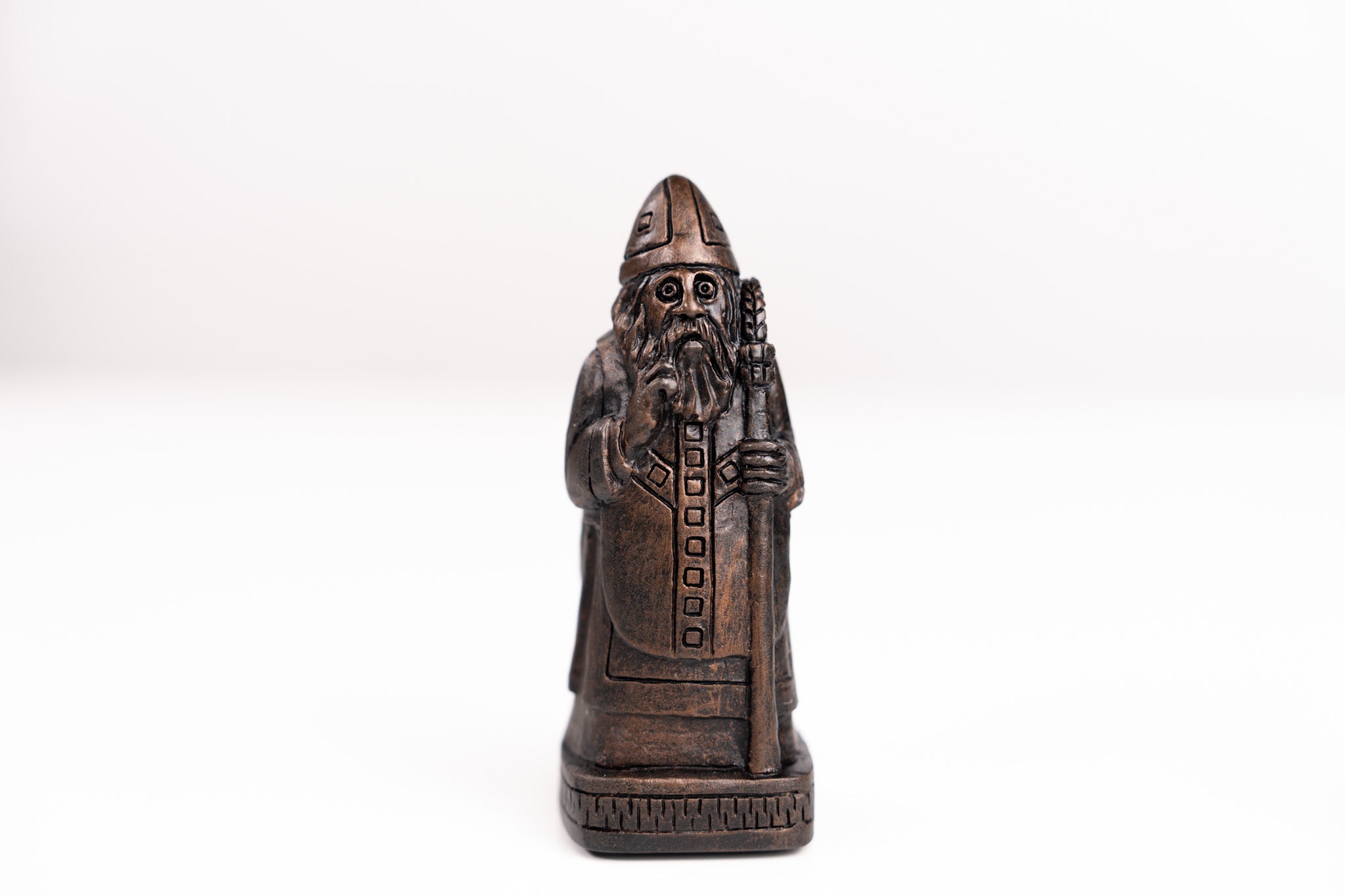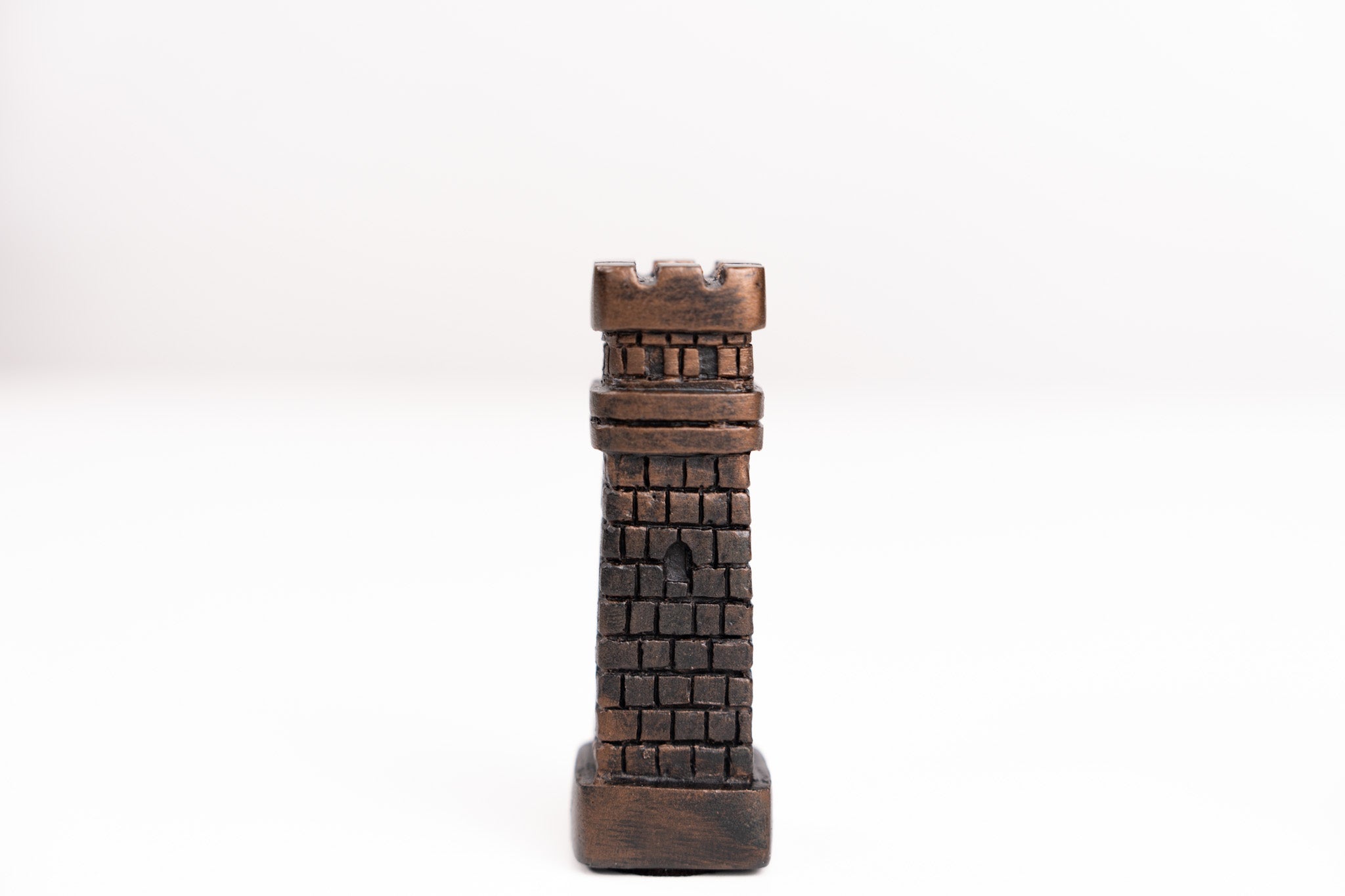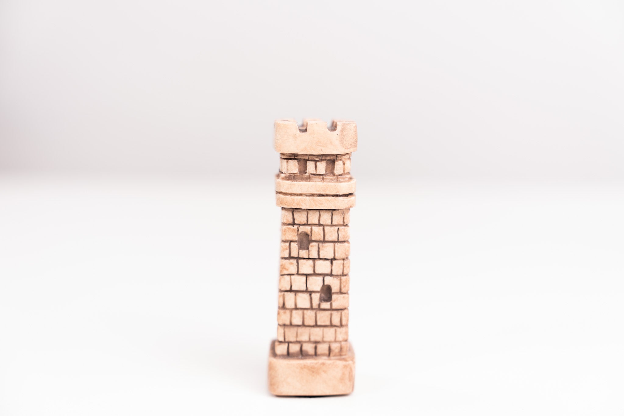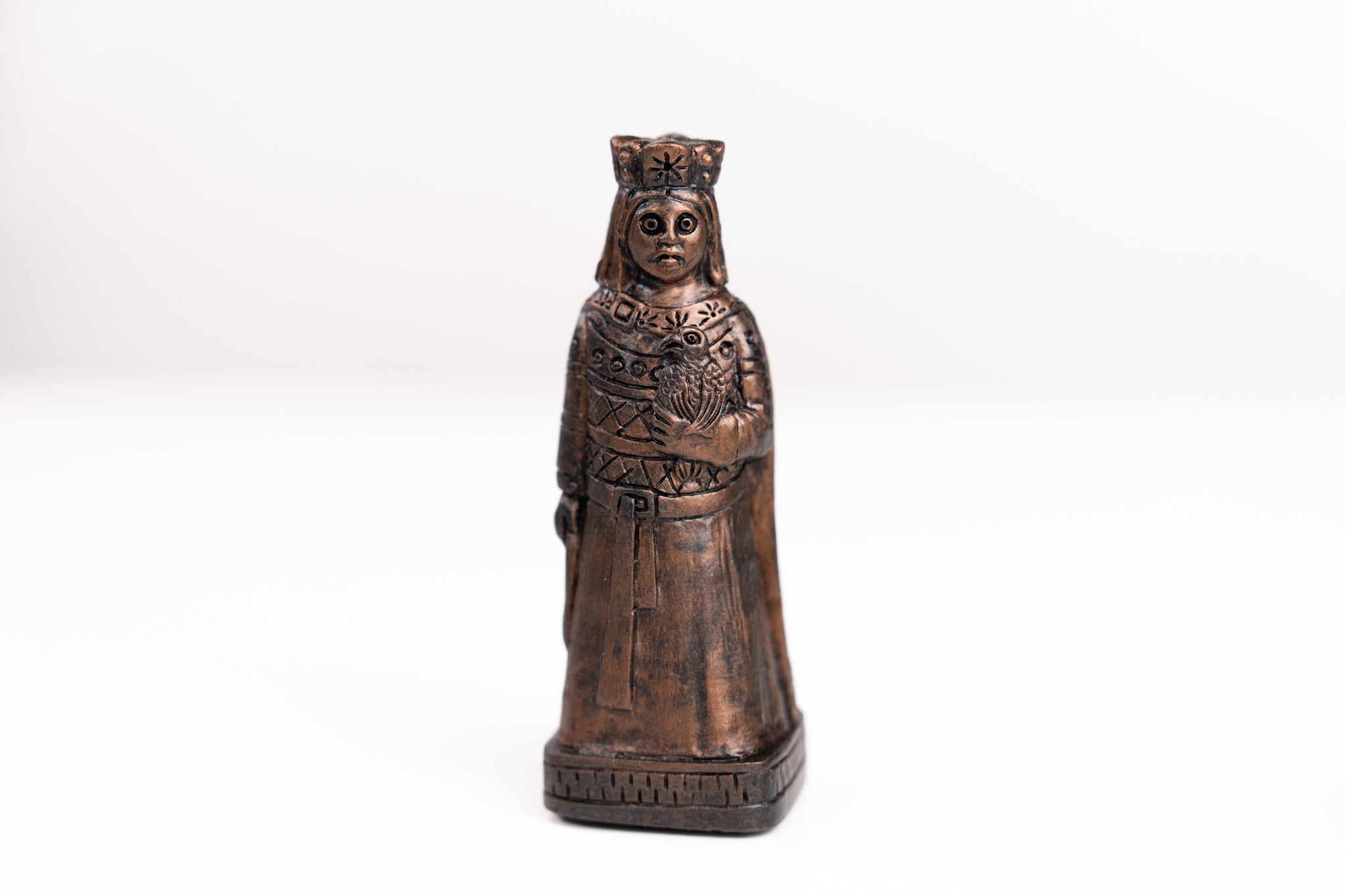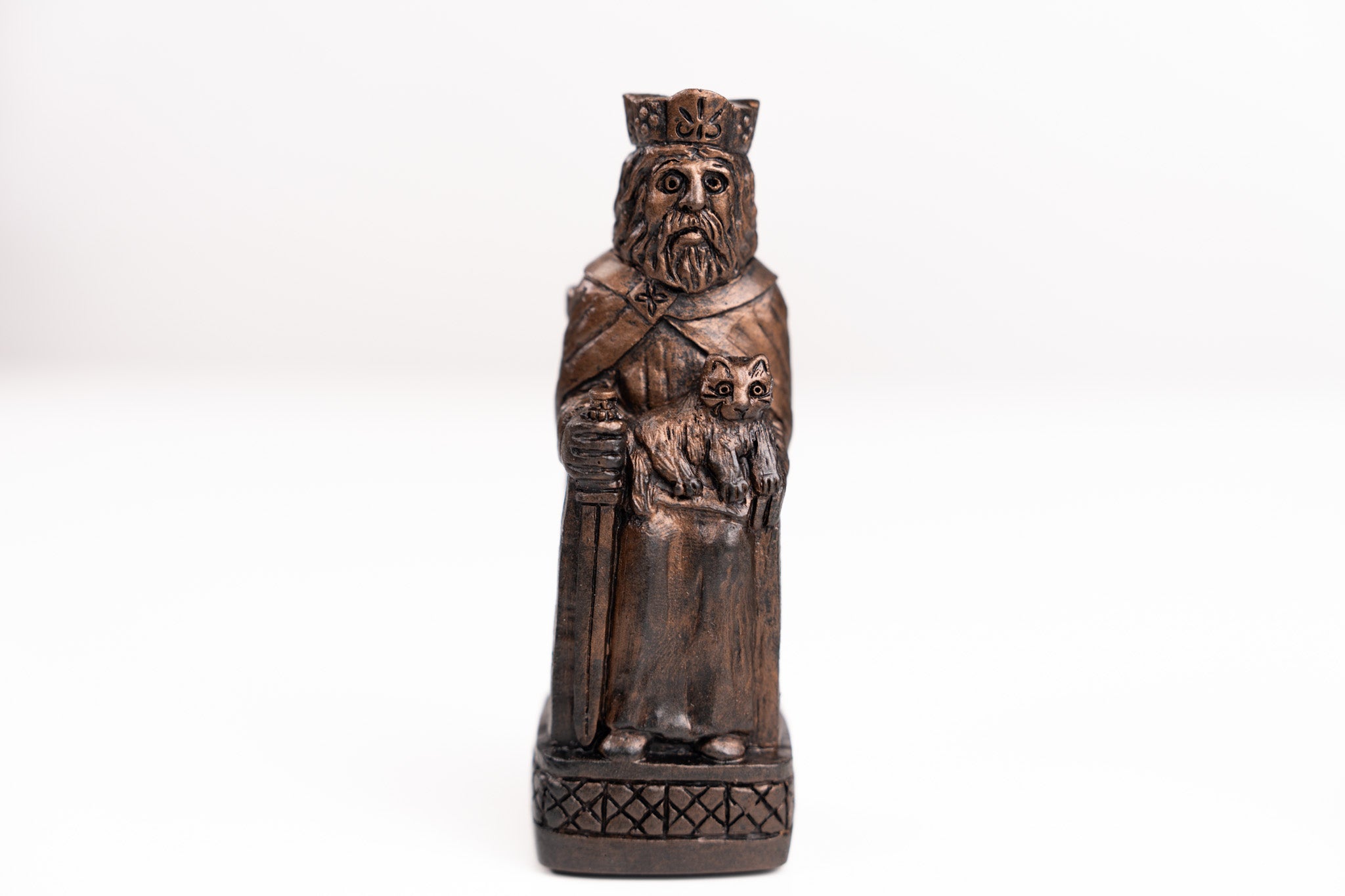 Each piece was originally modeled in clay, then molded and reproduced in wax. The wax patterns were refined for better detail and final molds were made for reproduction. They are cast in stone resin. These pieces are handcrafted entirely in the US. The pieces are substantial from 3 to 5 inches tall and are ideal with a chessboard with at least 2" squares.