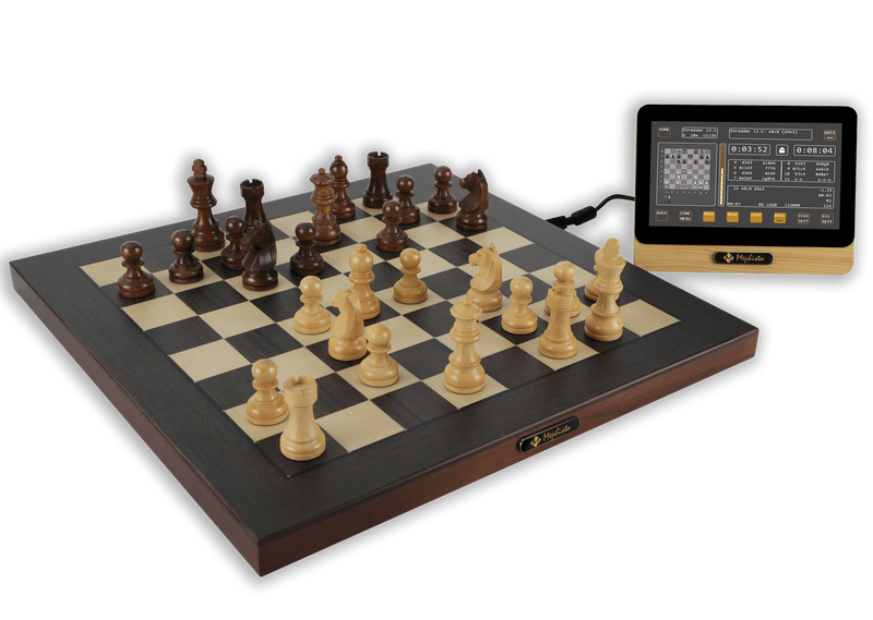 In wood style, the King Performance combines the powerful King program, Chess960, and a balanced set of features in a beautiful wooden chess board of a comfortable size. Exclusive is the ultimate chess playing machine with auto-sensing piece recognition.