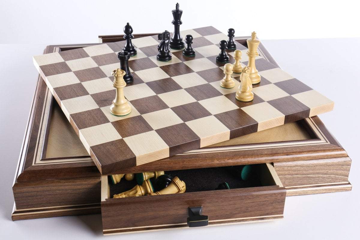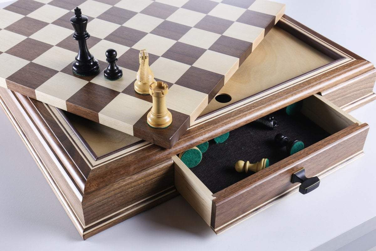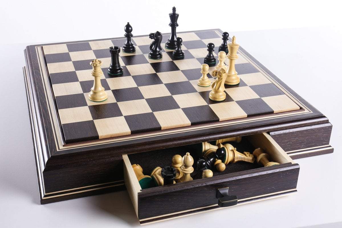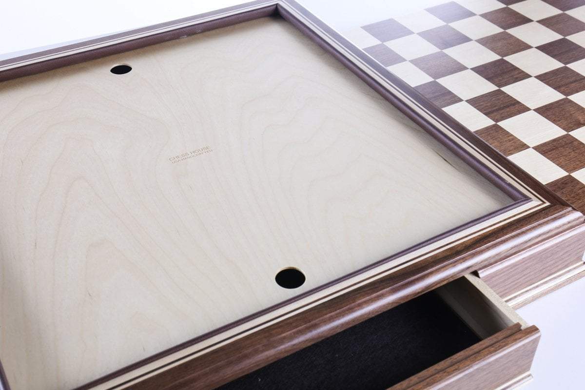 The JLP hardwood cabinet's storage drawers keep your chessmen safe and dust free, fitting any Staunton style chessmen appropriate to the chessboard square sizes of 2" or 2 1/4"