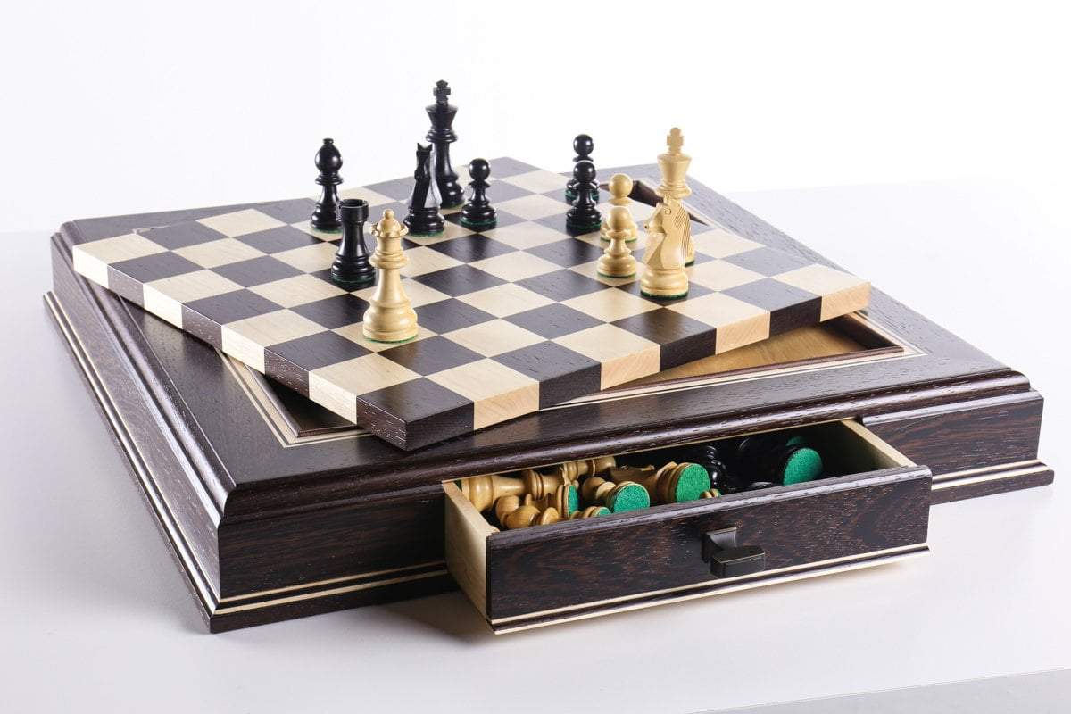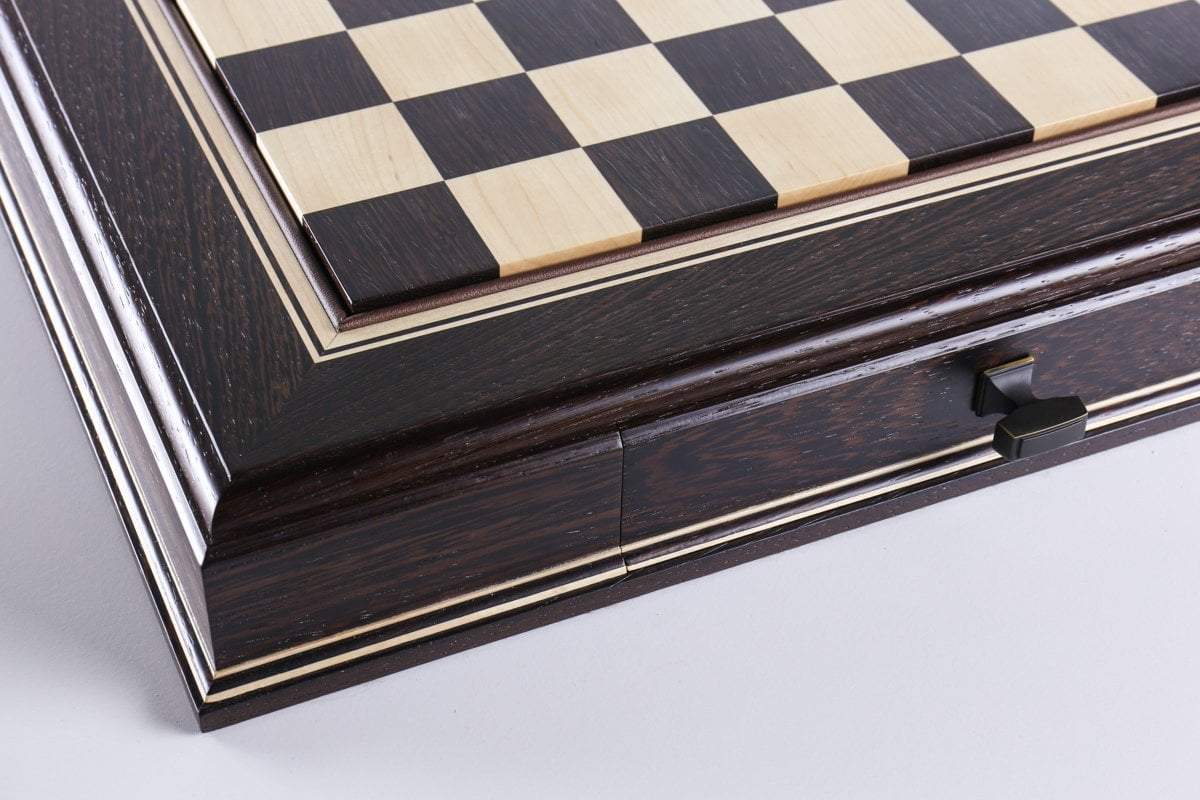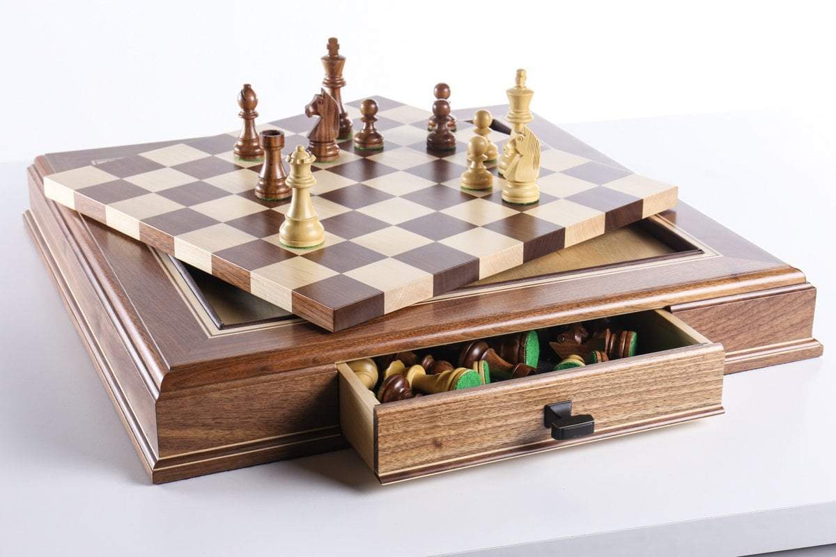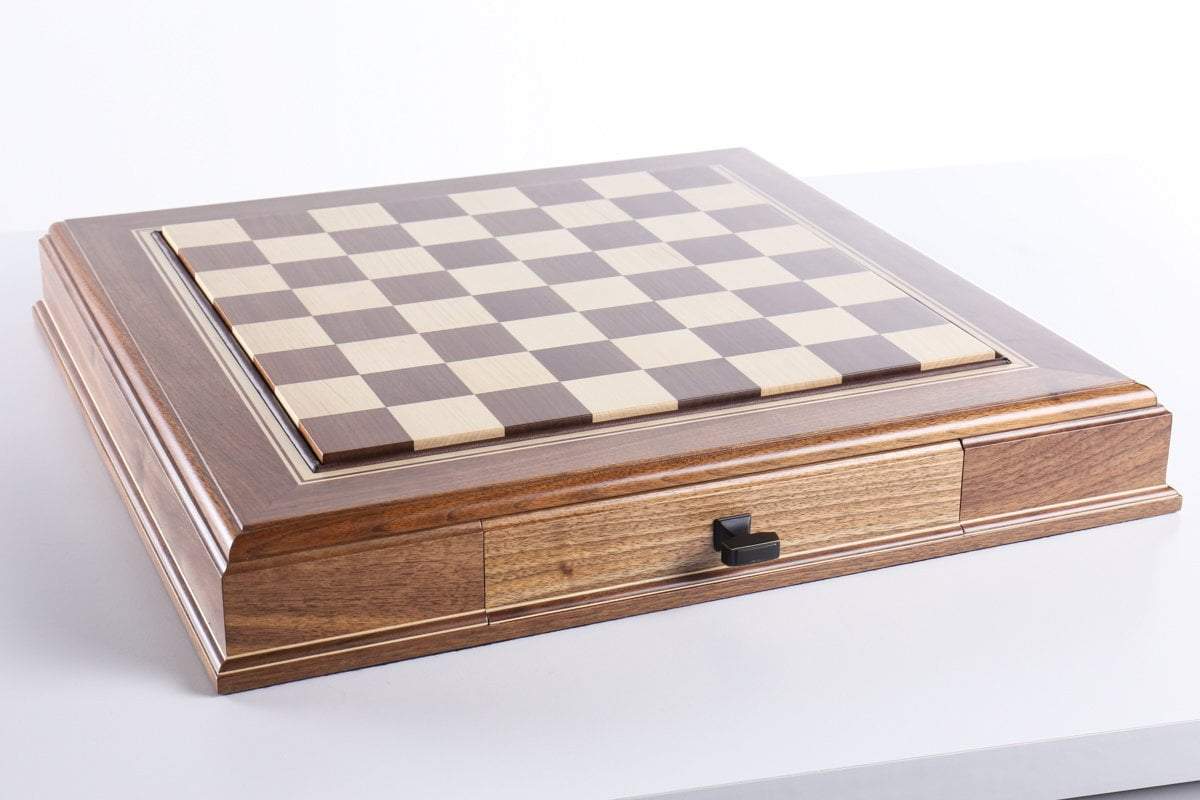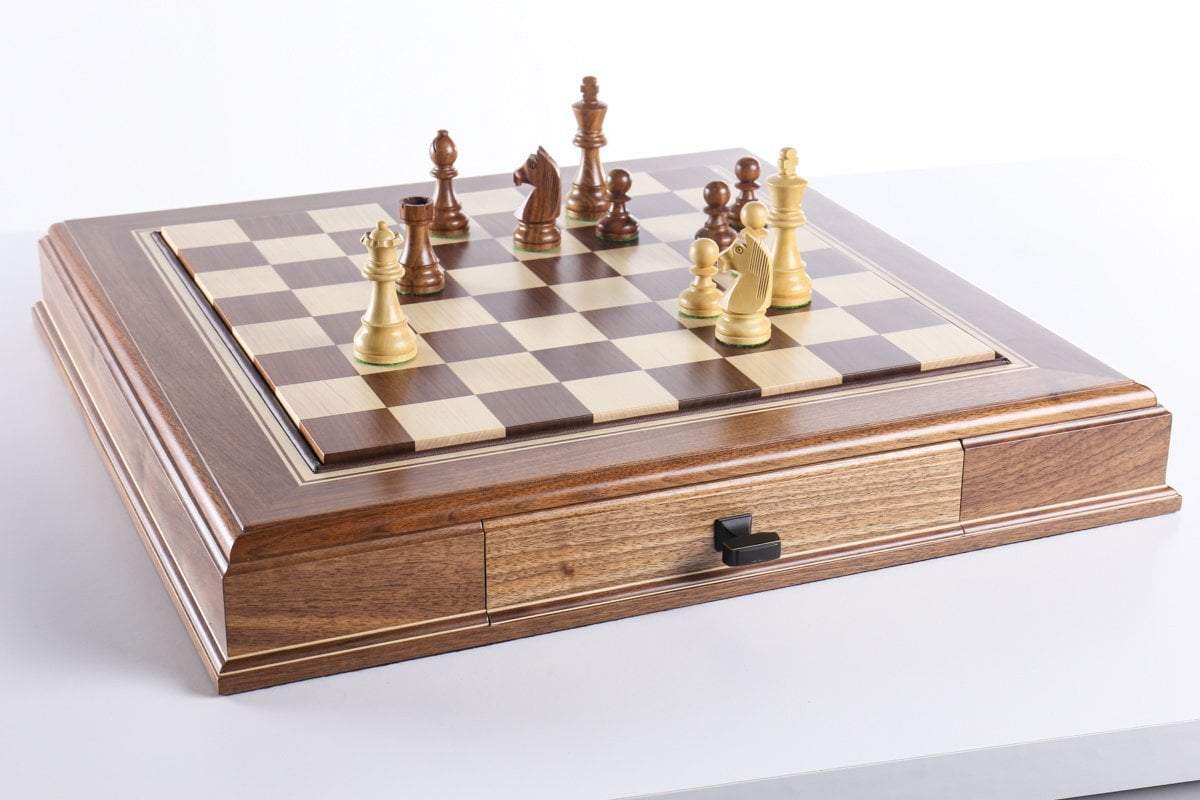 The JLP hardwood cabinet's storage drawers keep your chessmen safe and dust free, fitting any Staunton style chessmen appropriate to the chessboard square sizes of 2" or 2 1/4"