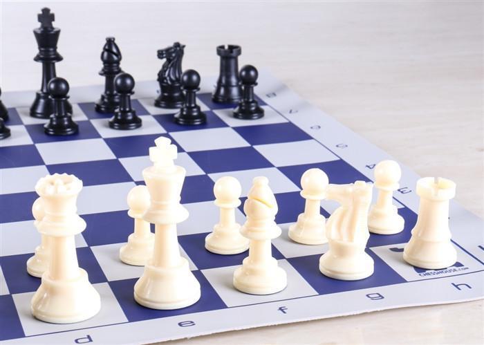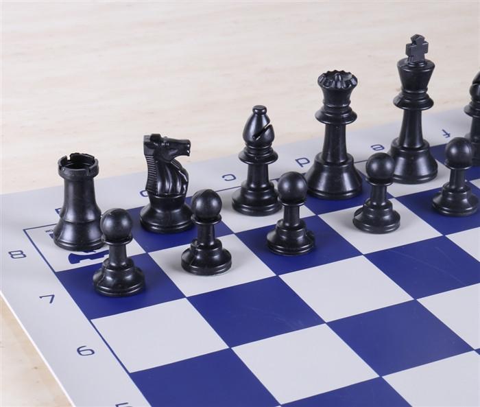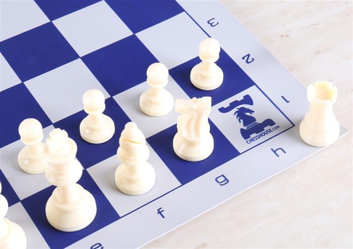 The conveniently small club style chess set is perfect for playing chess at home and on the go. At 14" square it's the miniature size of the club style chess sets. The pieces are 2 1/2" tall and the same type, but smaller size of the club pieces used in clubs and events. The vinyl chess board with Chess House logo rolls up easily when not in use.