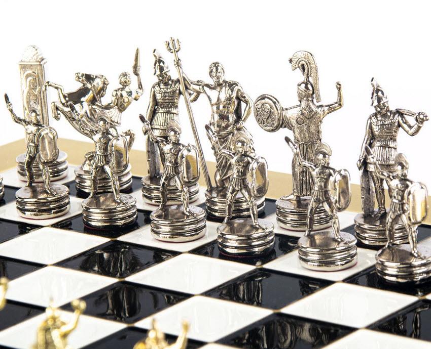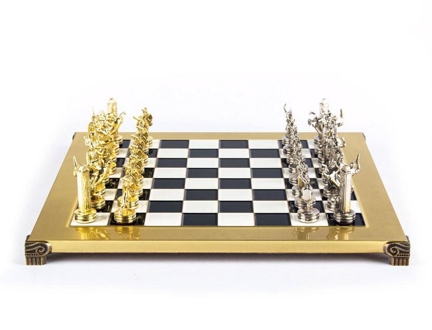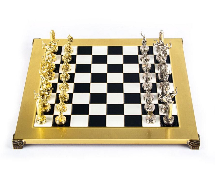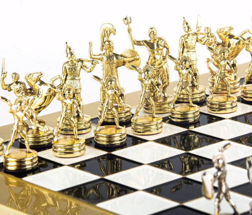 Greek sculptors loved to recreate this divine conflict through their art. The King is a replica of the famous statue “Poseidon of Melos” (2nd cent. B.C.), and the Queen represents the glorious “Athena Promachos” (450 B.C., Acropolis Museum). A bronze Hellenistic statue has inspired the Bishop and the Knight is a part of the marble facade of Parthenon sculptured by Pheidias. The castle is a reproduction of one of the most admirable Attic stele devoted to young Aristion who died in battle. Finally, the Pawn is a bronze statue of a fully armed warrior in 500 B.C.- Board size: 14"