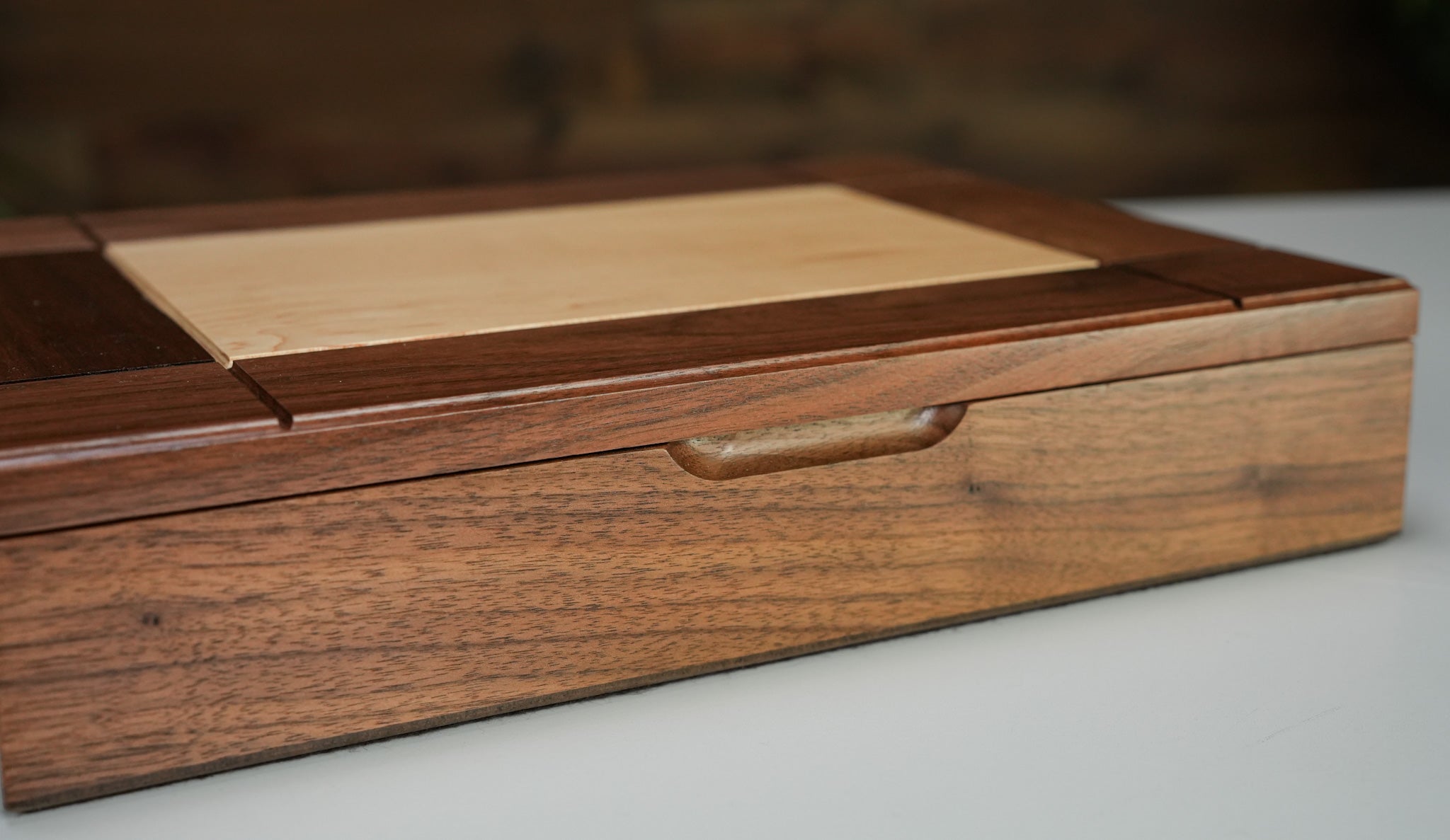 Hand crafted by experts in the USA and finished with that smooth furniture feel the box has a maple framed walnut lid and front thumb pull and has a felted bottom to protect any surface it is placed on.