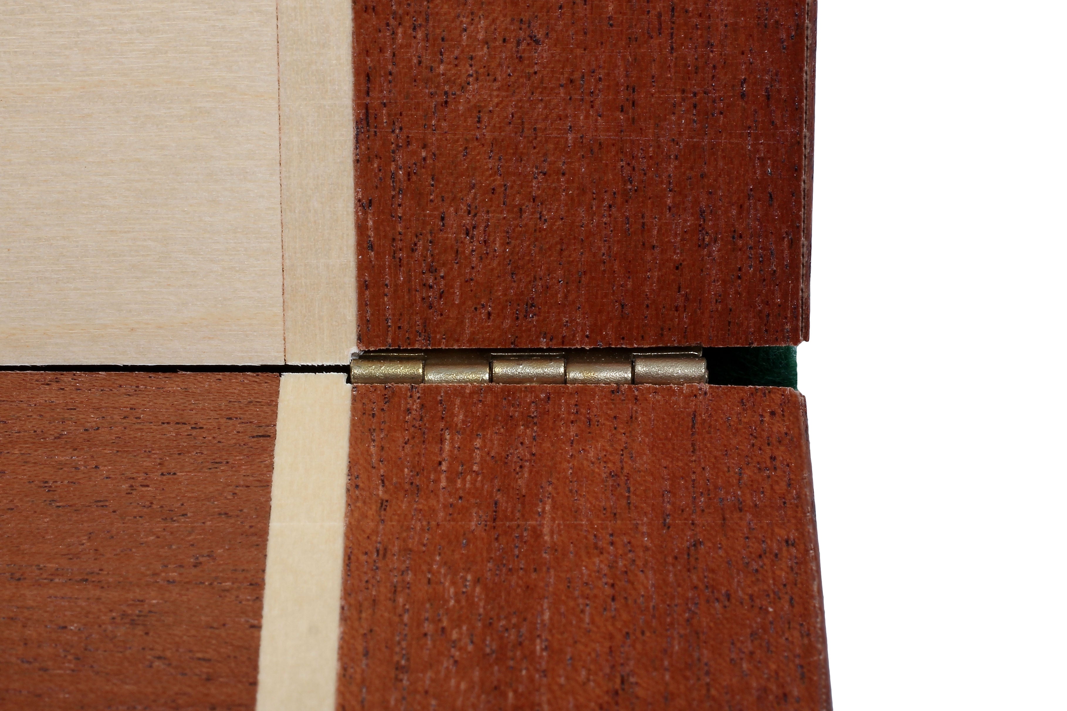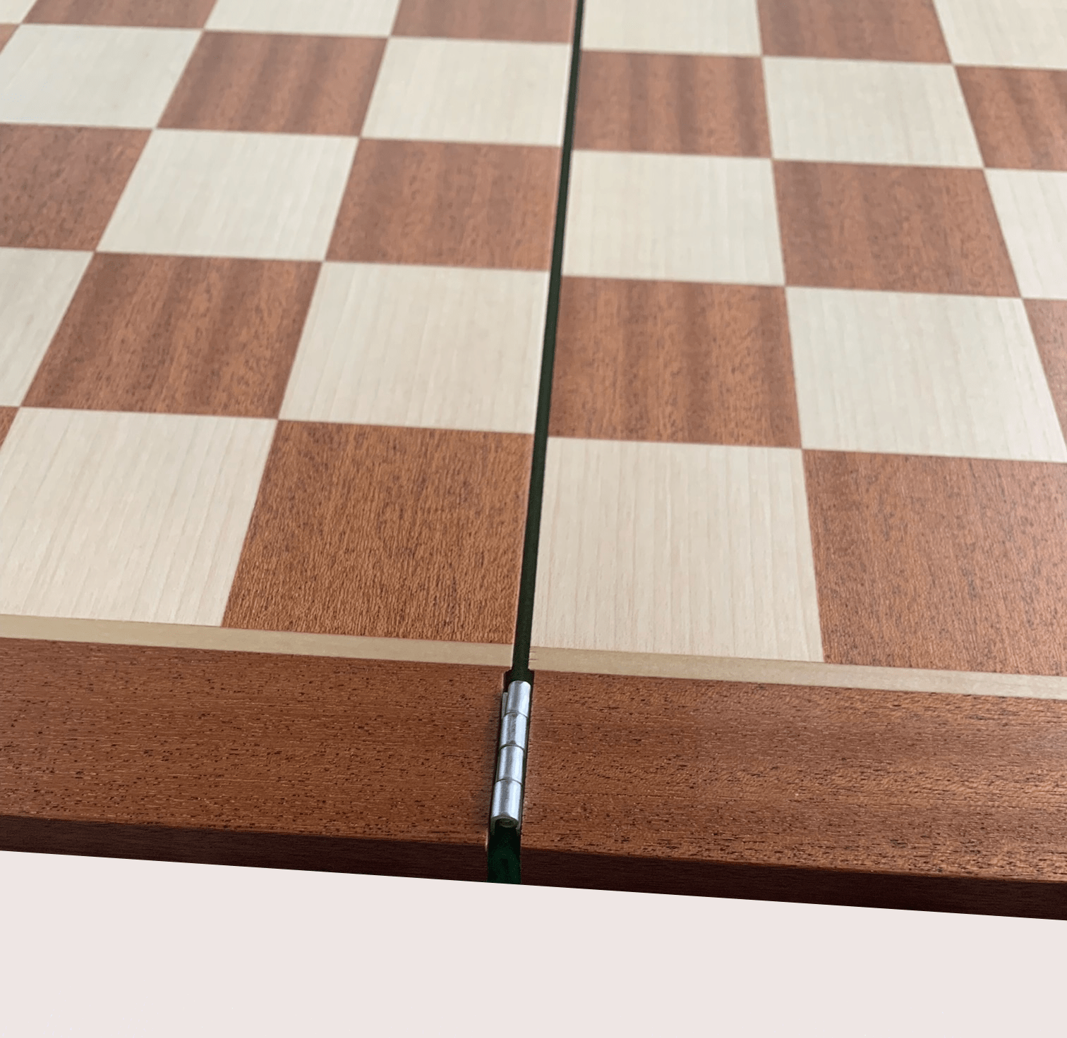 Folding mahogany and sycamore chessboard has a clean look and pairs well with many wood pieces. A folding wood chess board is more portable. 19" square with 2" squares it's ideal for classic staunton chess pieces. Instead of a gloss finish this board has a real wood feel as the surface is actual mahogany and sycamore veneer woods overlaid on birchwood core.