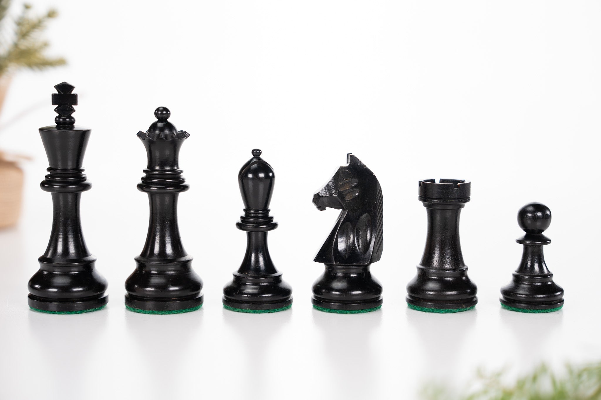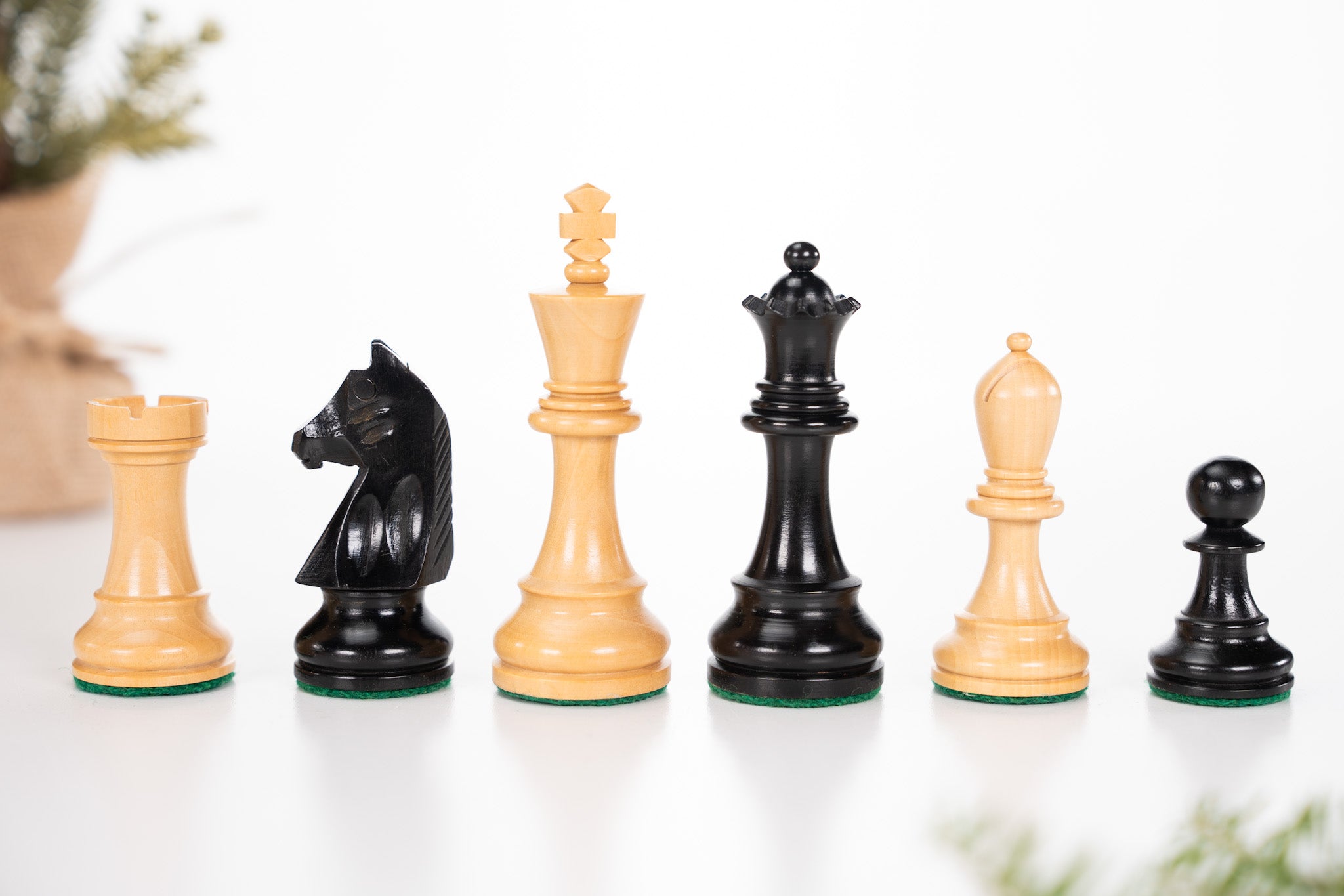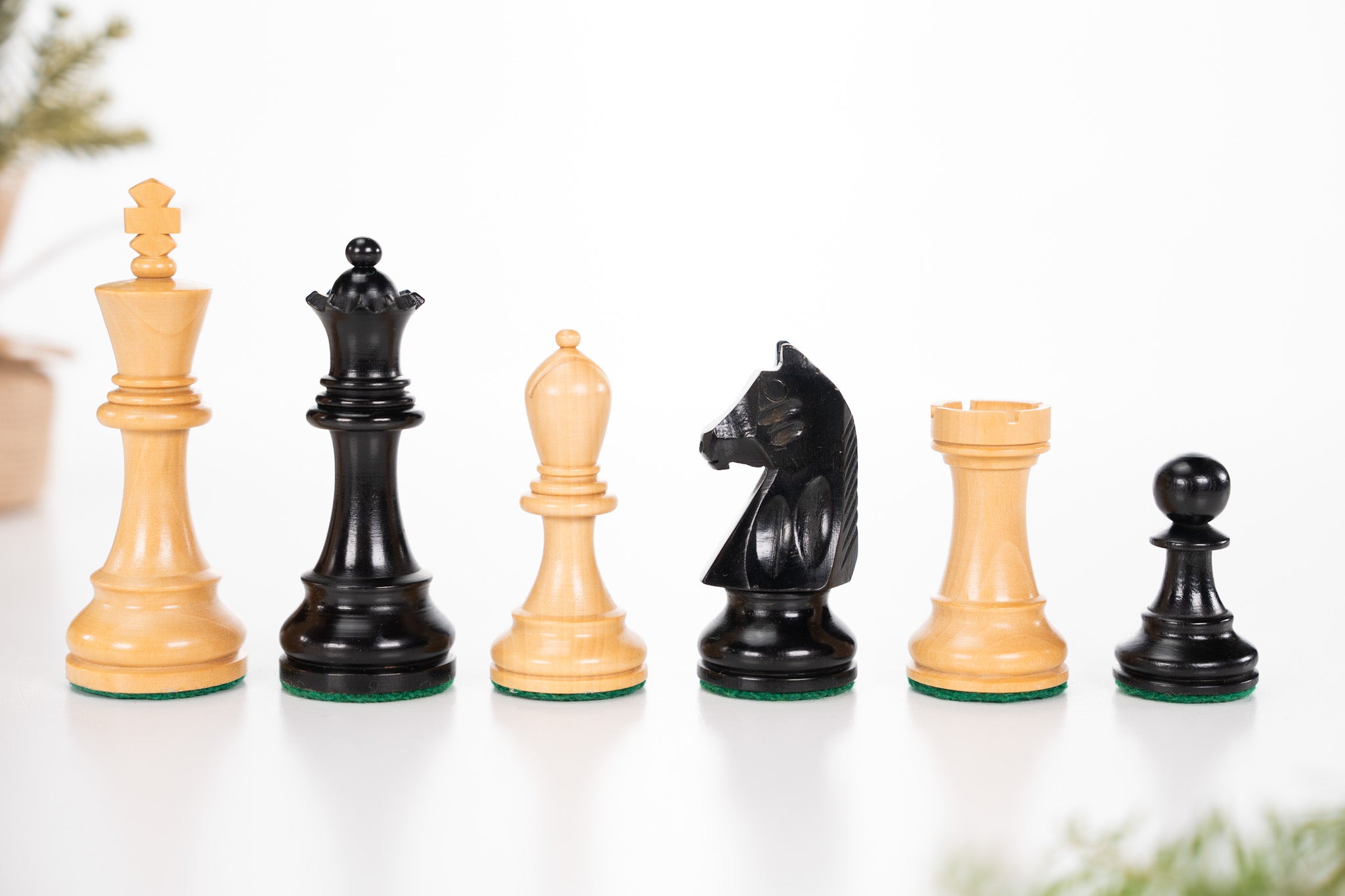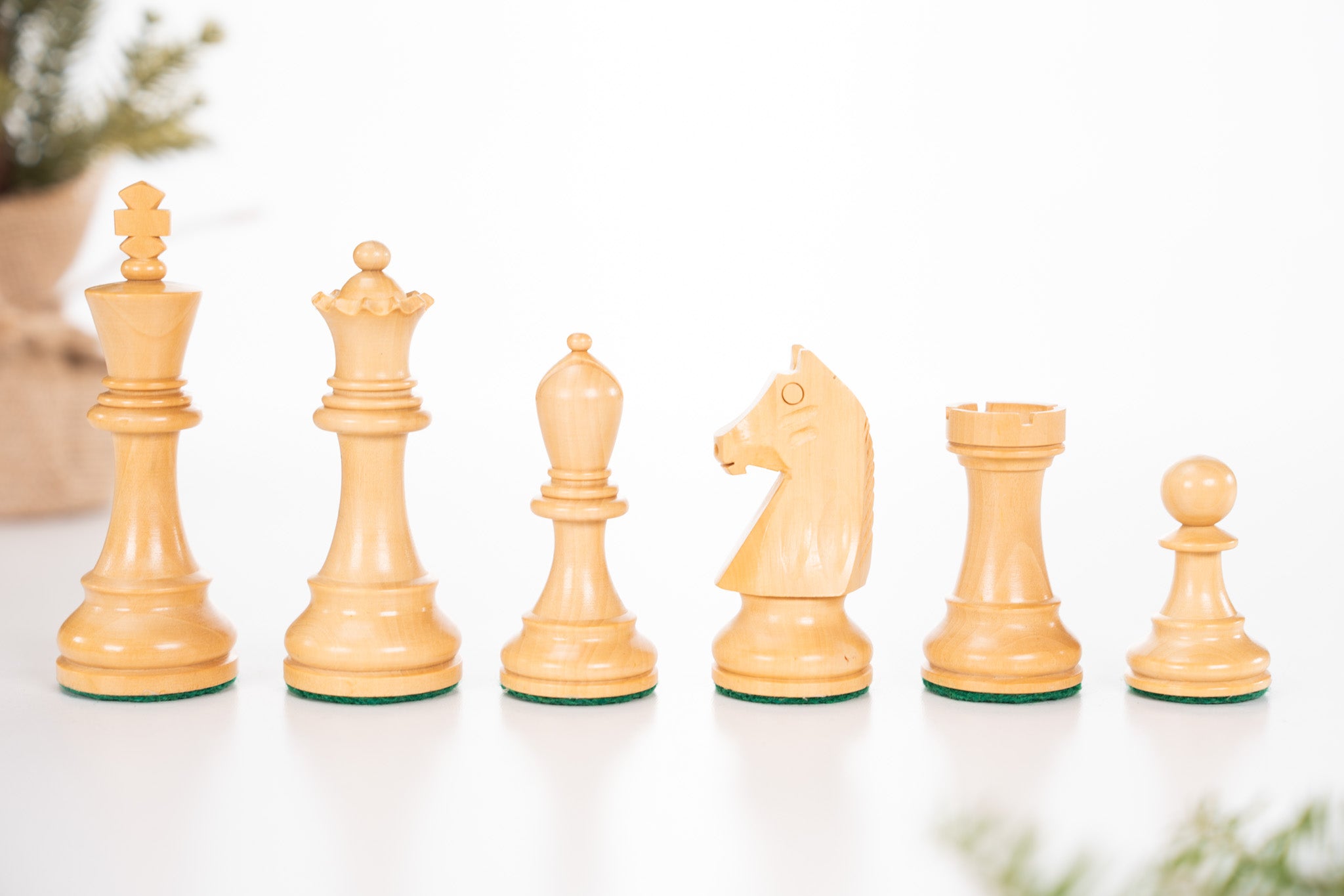 While this set is perfect for any age player and skill level, it's the ideal first wooden chess set. The sleek chess pieces blend championship specifications with a minimalist style. In particular the knight is fashionable, yet simple. The pieces are carved by master artisans from quality boxwood and nicely weighted for a fantastic chess playing experience. They are finished with a protective clear stain. Felt bases protect a chessboard and enhance the smooth playing quality.