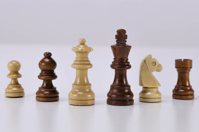 Most wooden chessmen consist of a light wood of the boxwood variety paired with a darker wood such as ebony, stained boxwood (ebonized), rosewood, shishamwood (Indian rosewood), acacia, and others. Each piece is heavily weighted for optimal balance and stability during play.