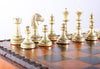 From Italy, this brass and silver finish metal chess set plays on an elegant black and amber tooled leatherette board with storage. The pieces are solid metal and are brass and silver plated. They do not have to be polished as they have a protective coating on top so they will not tarnish. The board is a leatherette (vinyl) over pressed wood. Made in Italy.