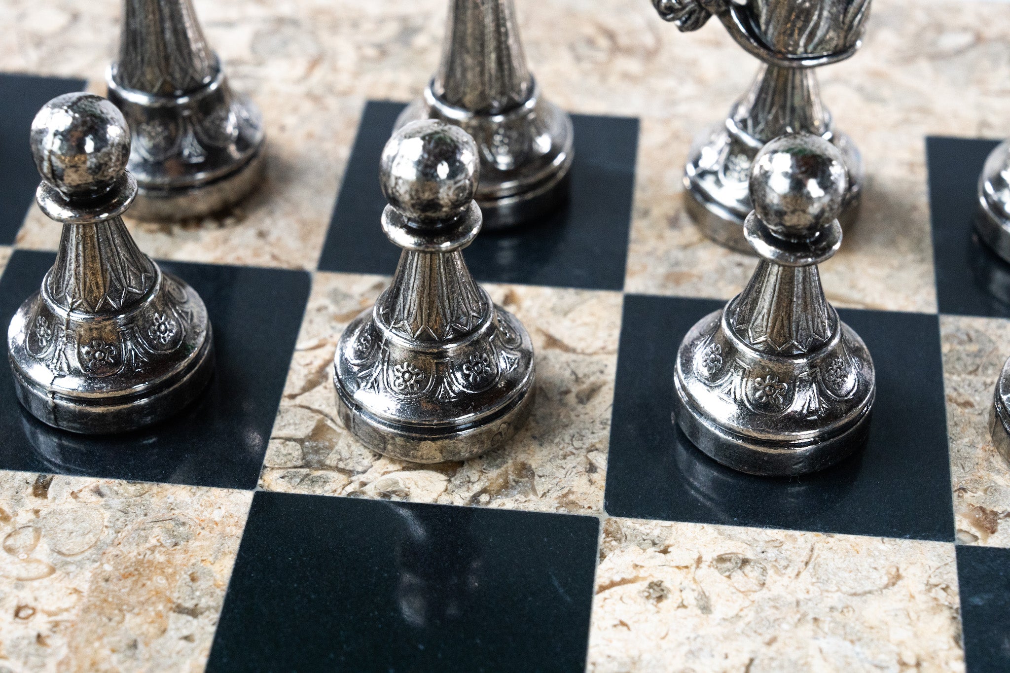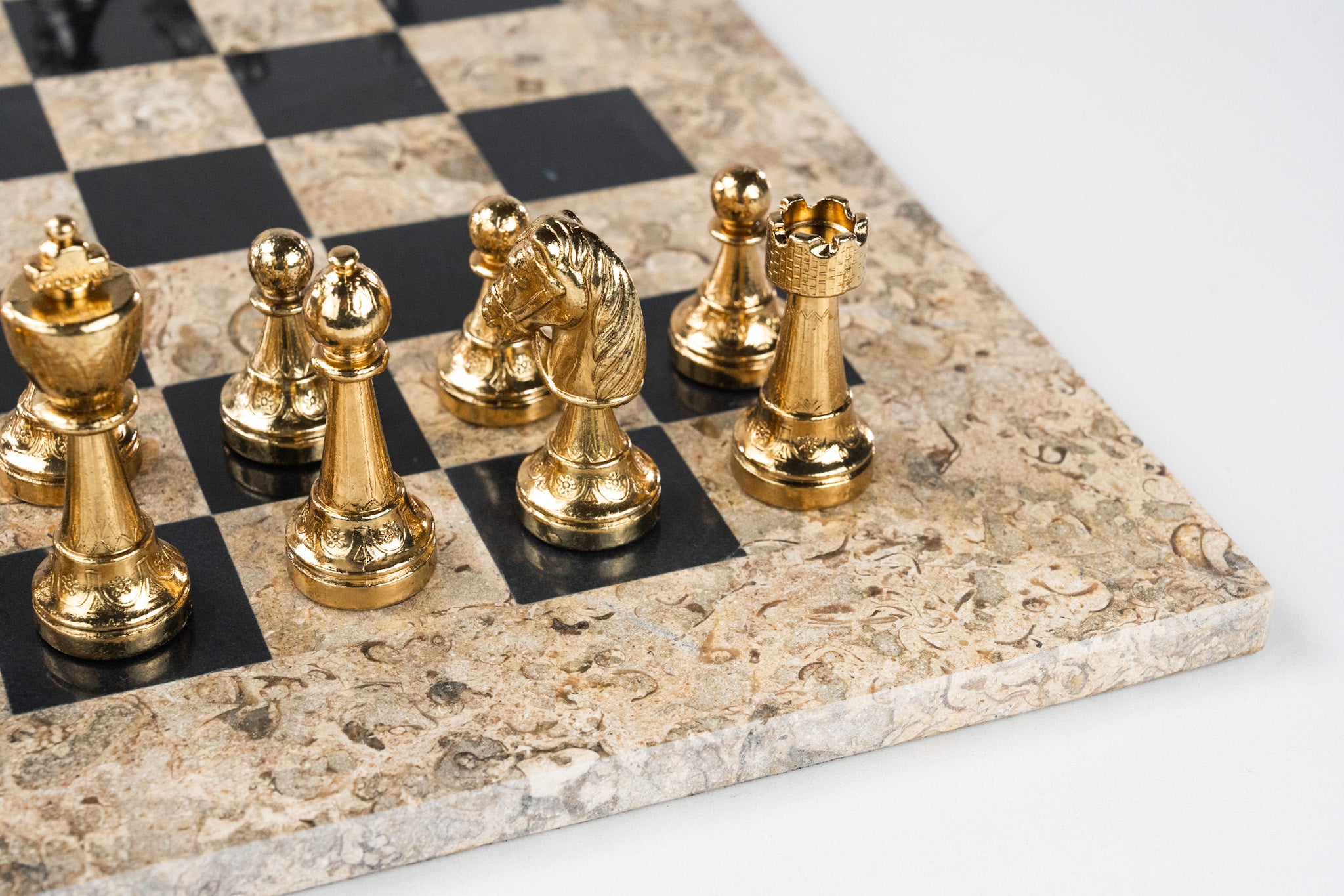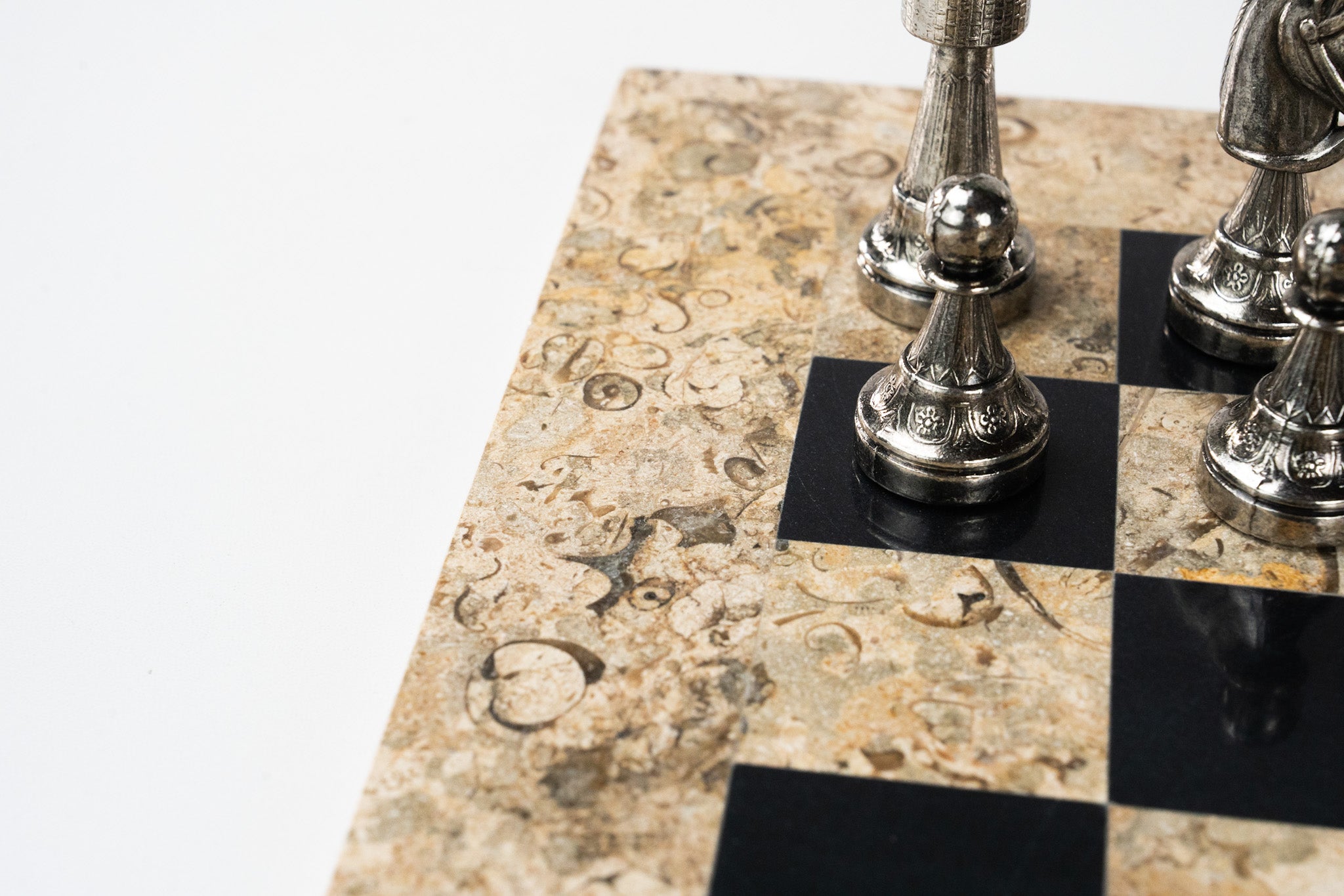 Coral, Marble and Metal come together in harmonious fashion to make this 16" Coral and Black Chess Board with Metal Florentine Pieces
