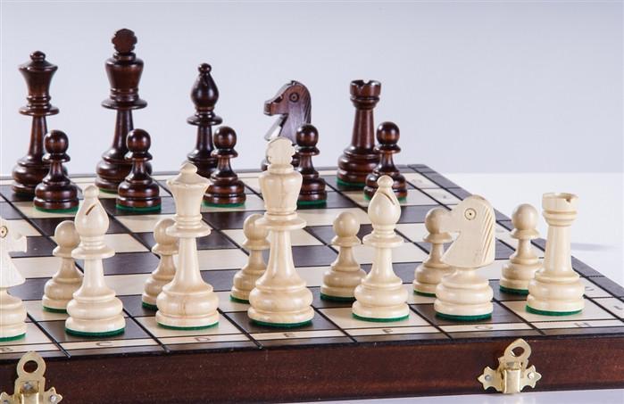 The Olympic Chess Set has slender, yet well-defined pieces still somewhat close to Staunton in design. At 16" square it's midsize and usable for many chess set needs. The board even features the coordinates rarely found on wood chess sets.