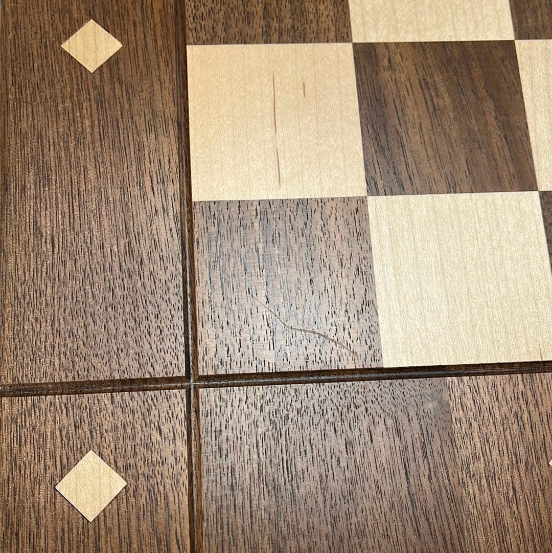 More about the board. The creator of this chessboard has studied wood movement extensively. Wood is "living" after it is cut down, not a rigid block. Due to the circular ringed nature of a tree, the direction of cuts is very important to the natural expansion and contraction of the wood as humidity levels change from one environment to another. This unique expansion of both woods used in this work of art, require great attention in every phase.