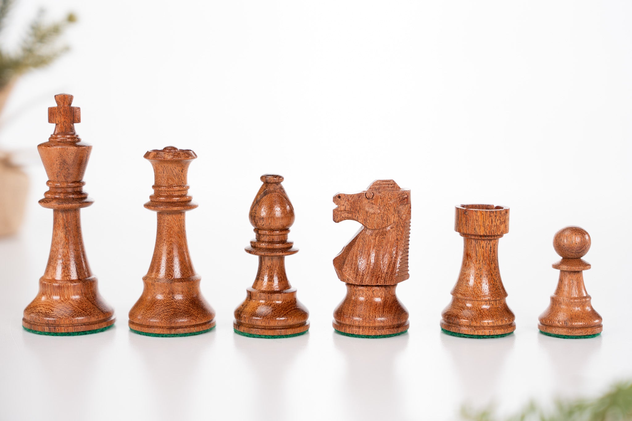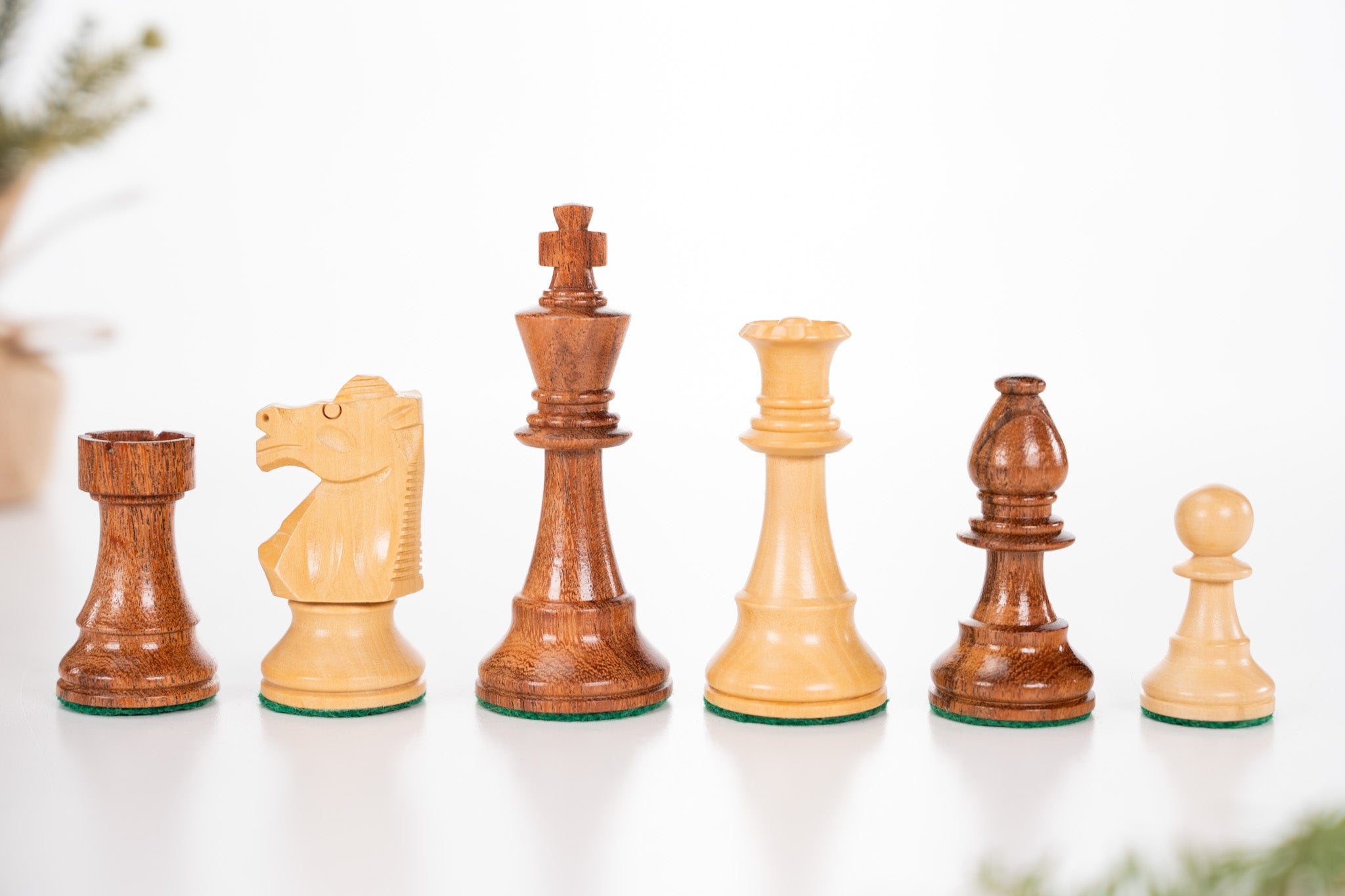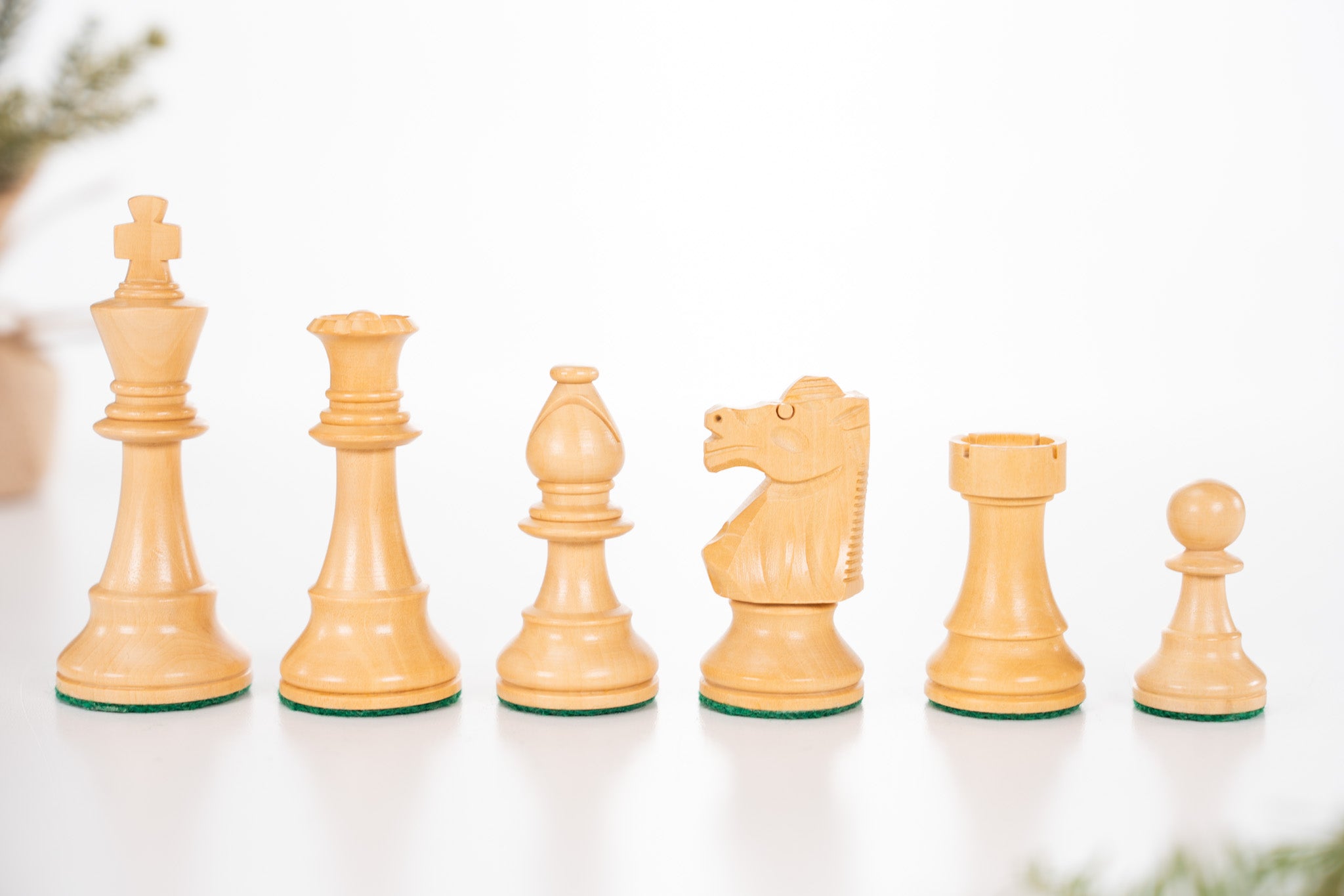 The sturdy club style design is heavily weighted and has no delicate points to break or chip. The pieces are felted for smooth play and to protect a wooden chessboard.