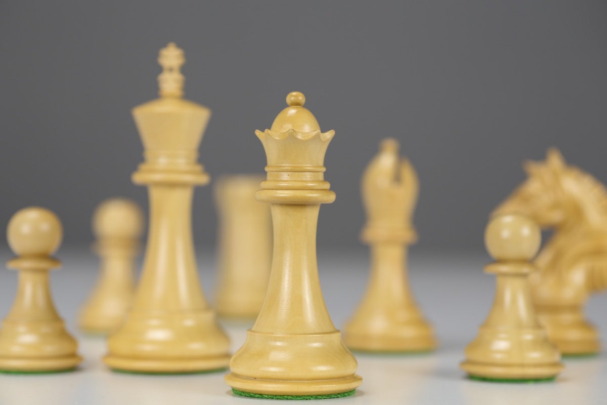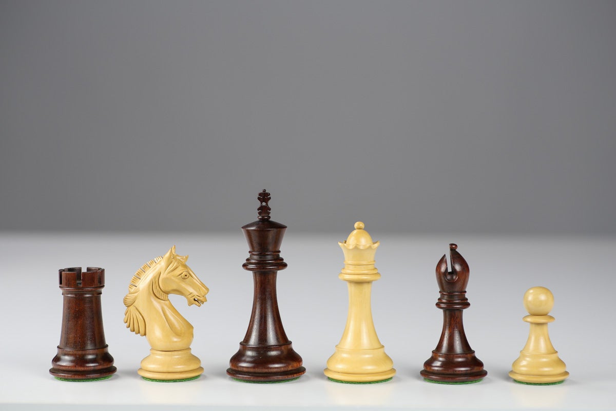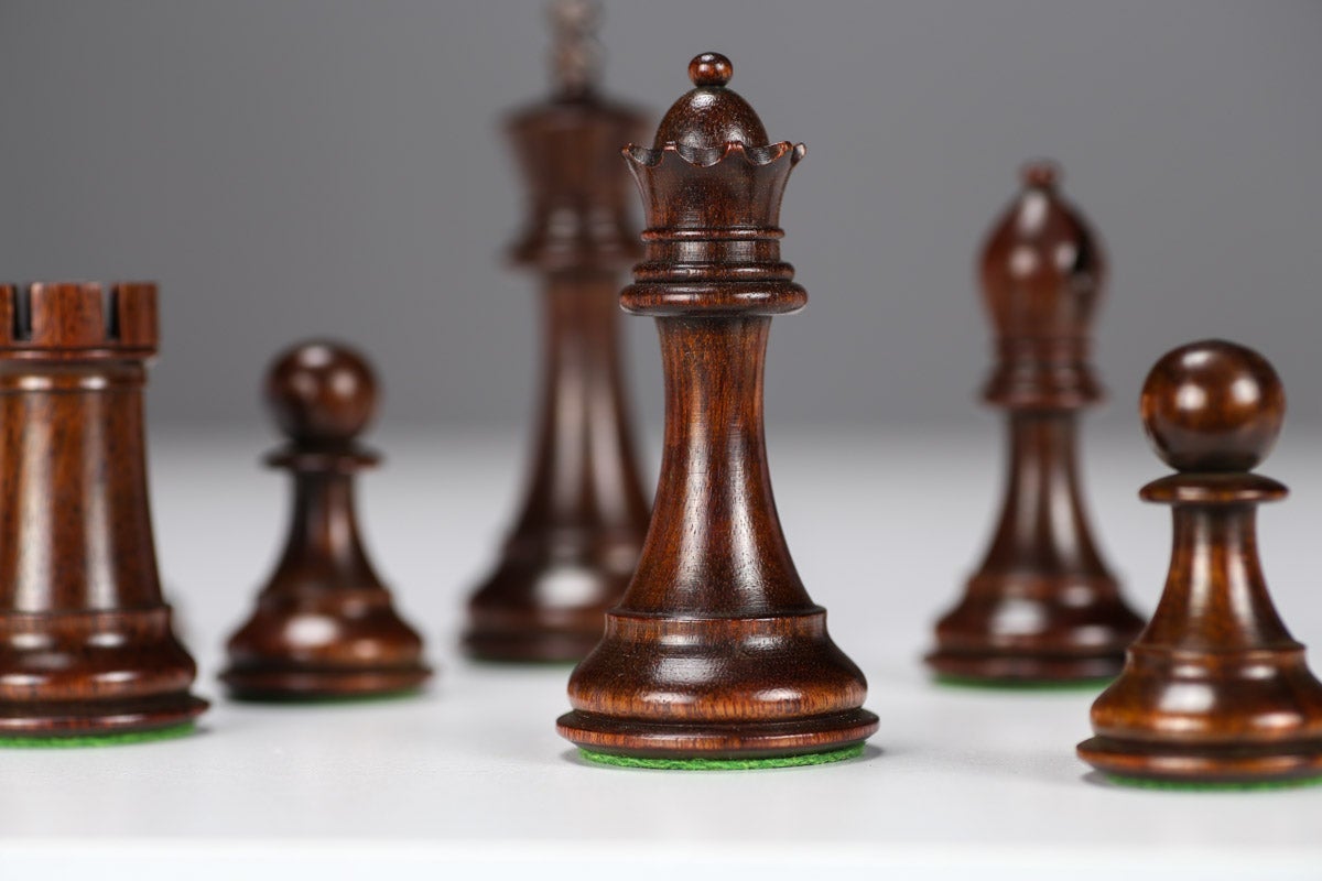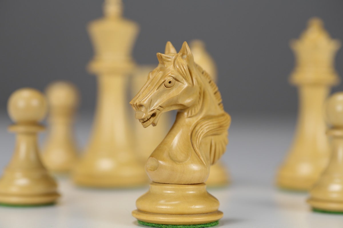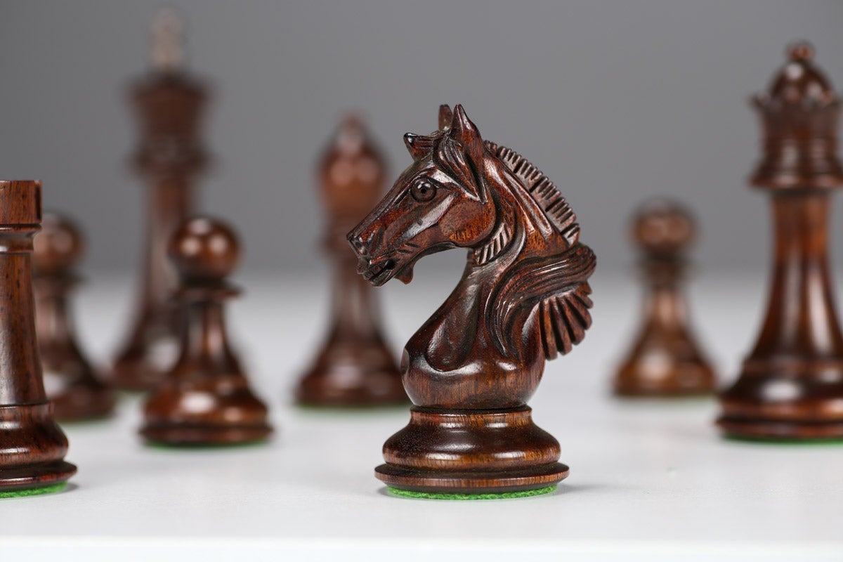 As with most luxurious wooden chess sets, the knight piece distinctively sets the tone for the entire set of chessmen. Here, the intricate, hand-detailed steed is alert and poised for battle, thoroughly complimenting the entire set of chessmen. In all respects, a fine and luxurious set of genuine Anjan wood chessmen from one of India's finest craftsmen. Finished and polished to near perfection, the chessmen are a fine piece for any collection, or a wonderful second or third chess set for someone who enjoys the game.
