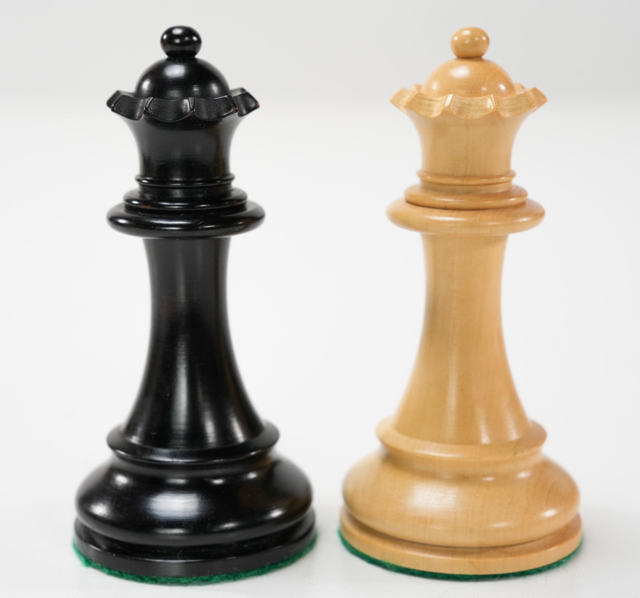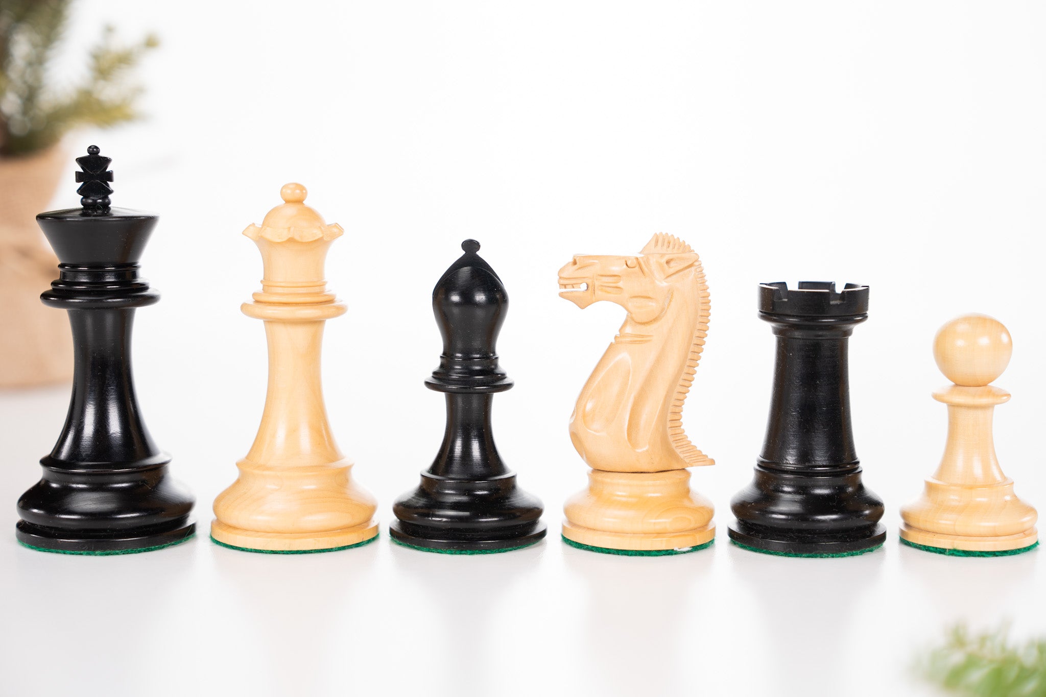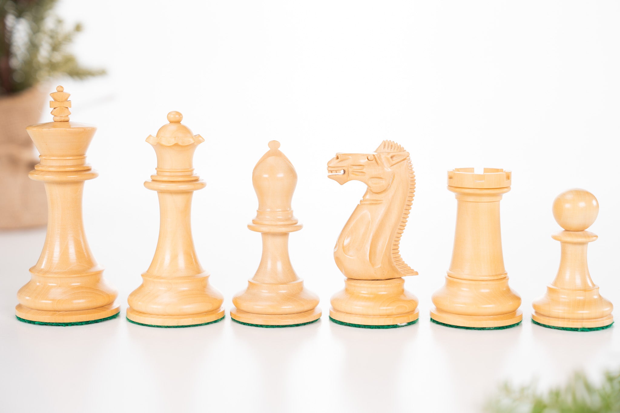 Felted bases for effortless moves on a chessboard make the chessmen a delight to play on any wooden chess board of suitable size. The King is a full 4" tall, and the King's base will be suitable for a chessboard with squares averaging 2 1/4" to 2.5”.