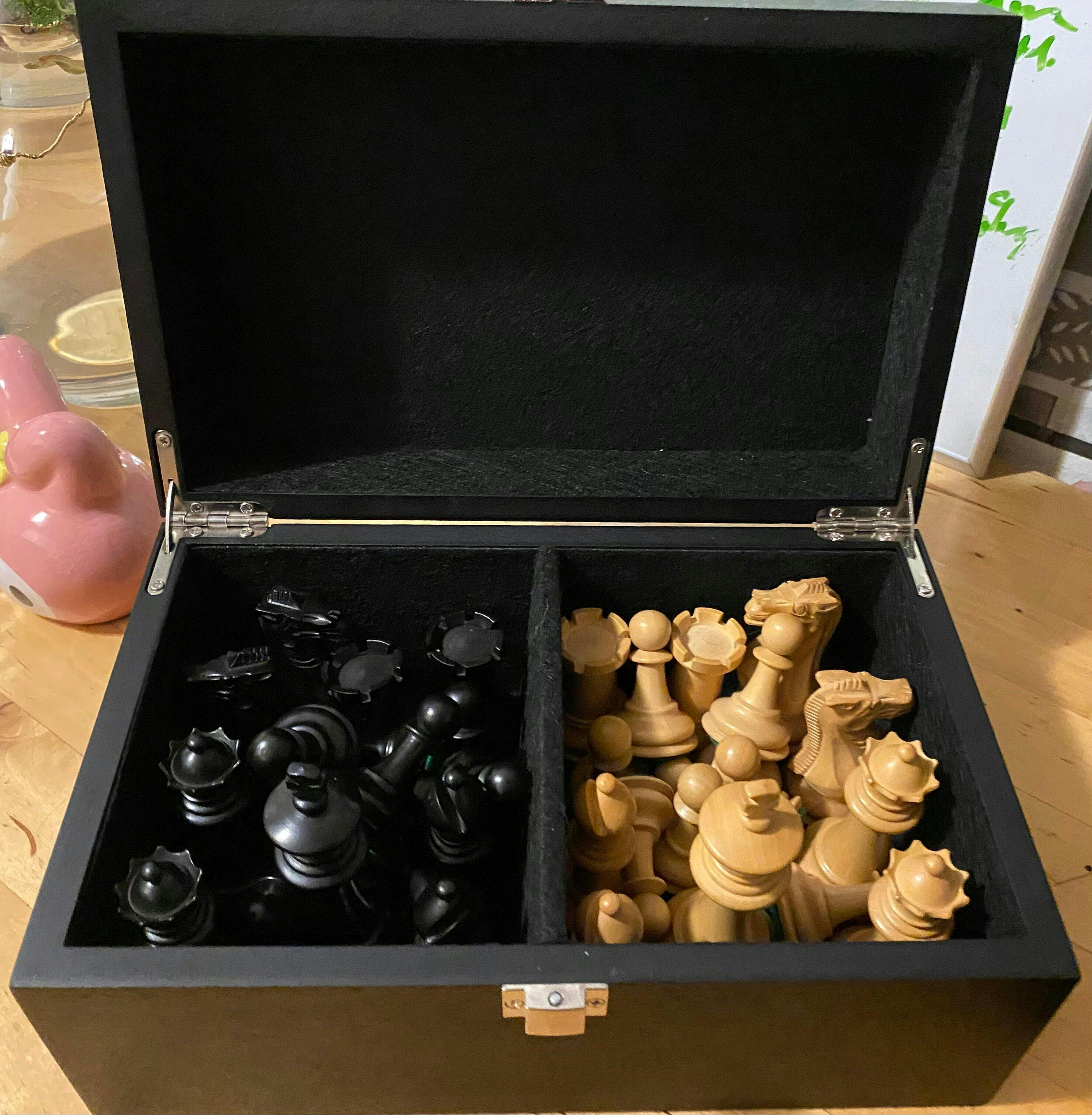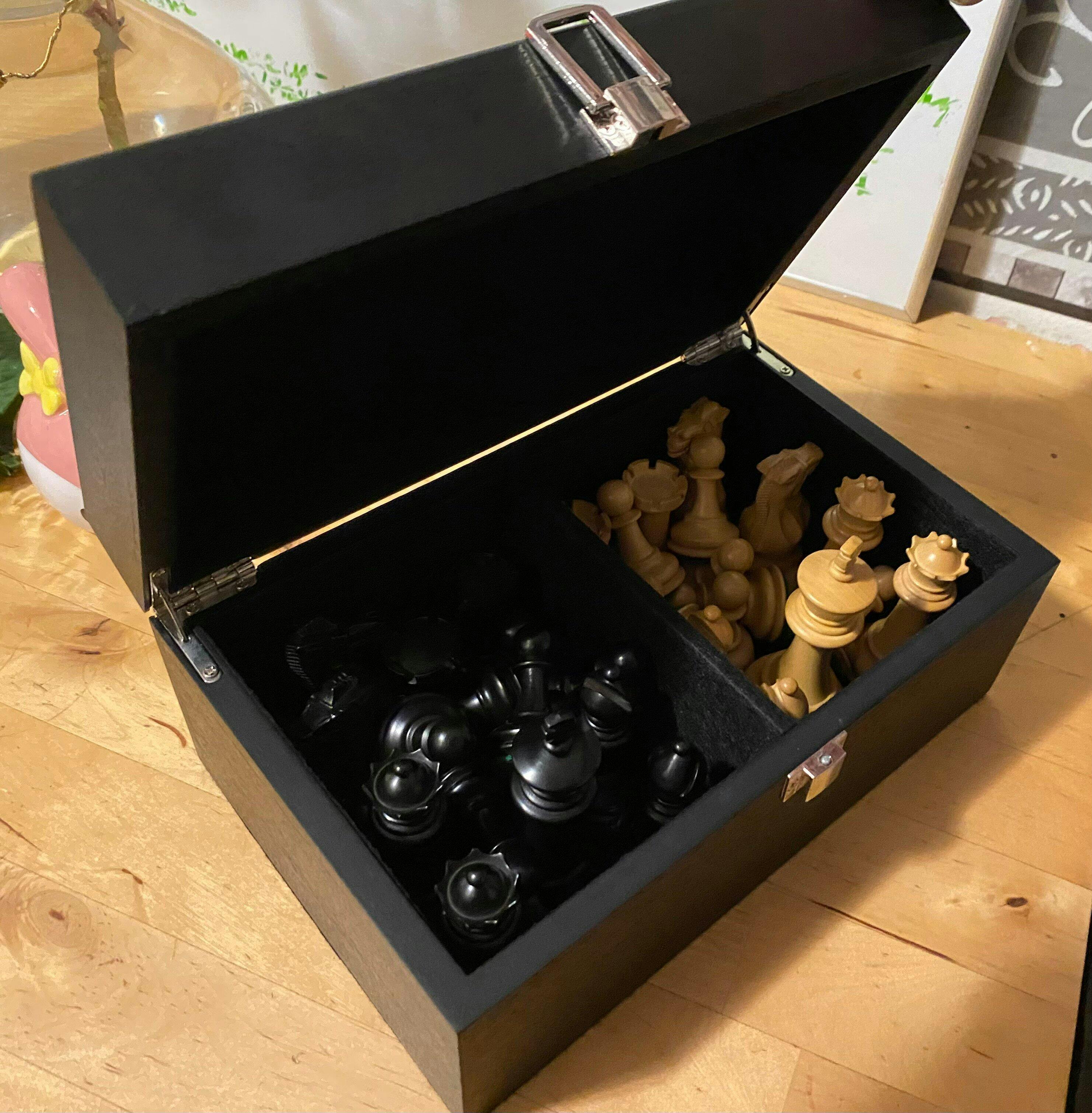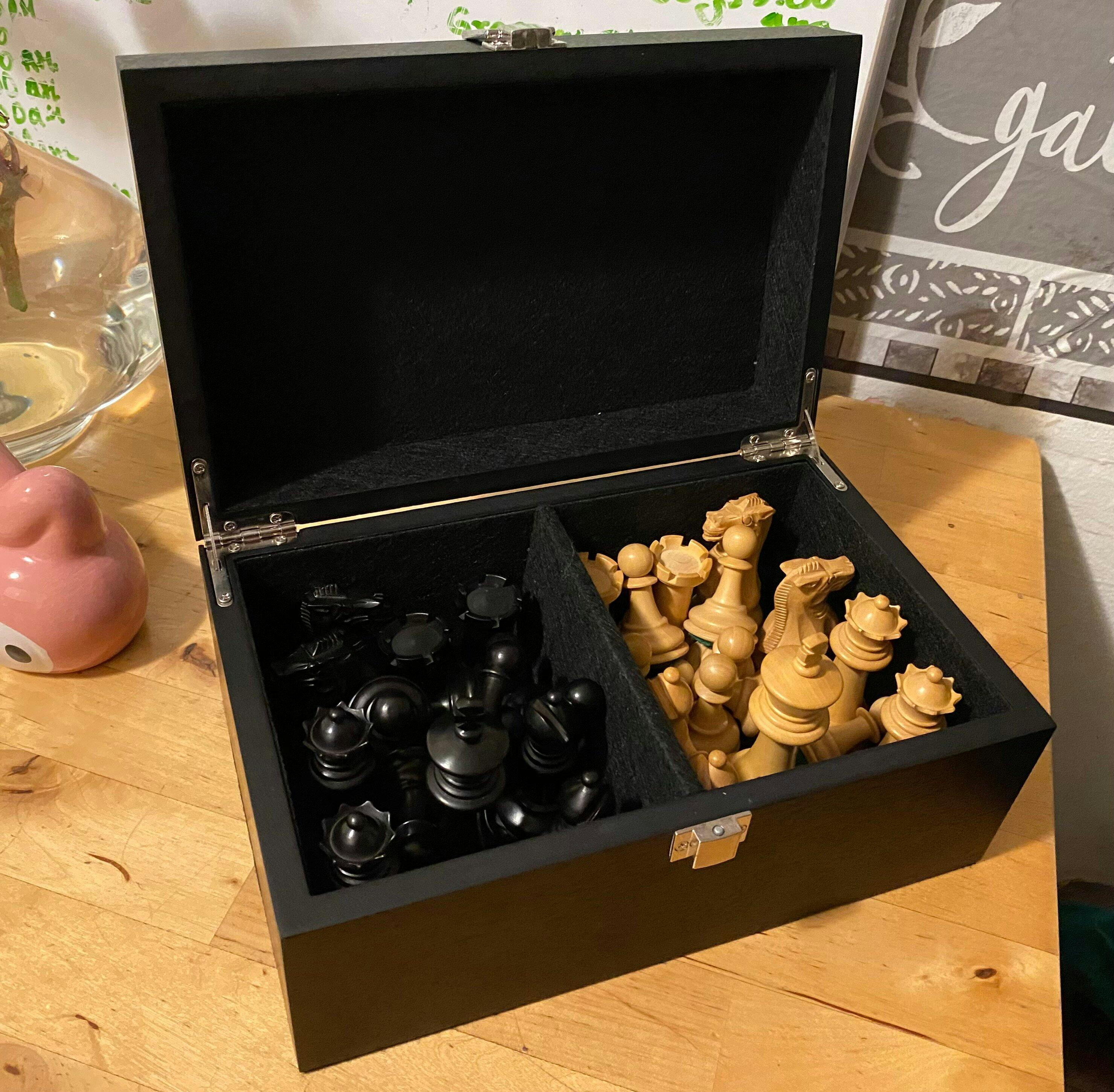 Safely store your wood chess pieces inside this sapele box, designed primarily for wooden chessmen with a king height of 3.75" to 4.25" tall. Even with extra queens, the box will be a good fit for the entire set.