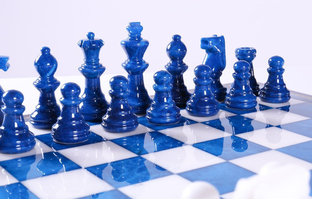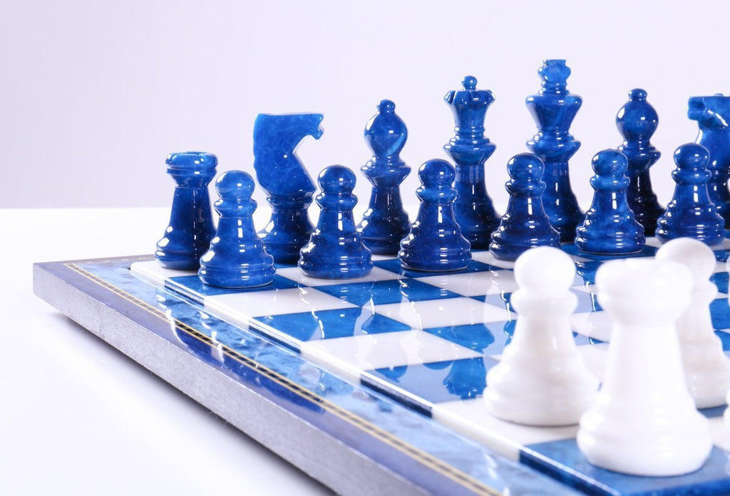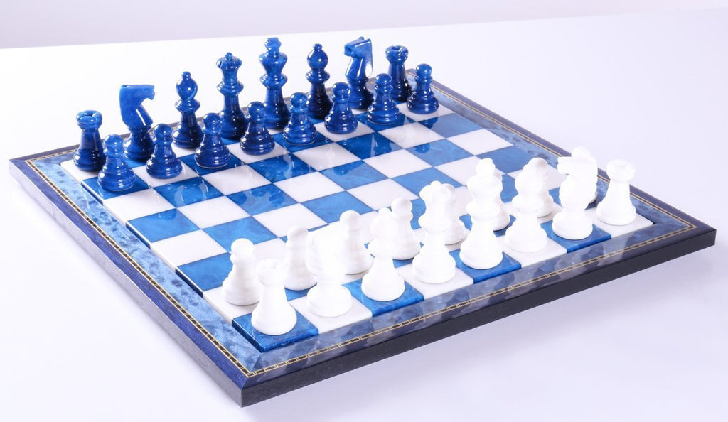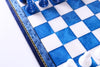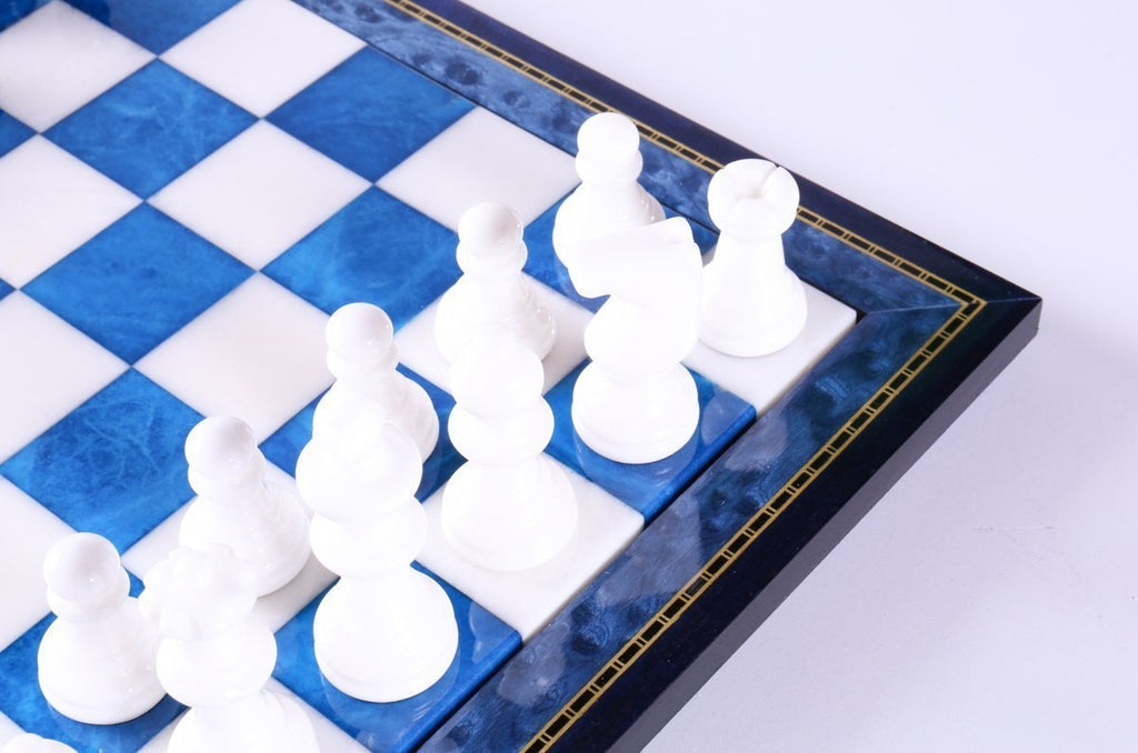 About The Blue & White Alabaster Chess Set with Wood Frame