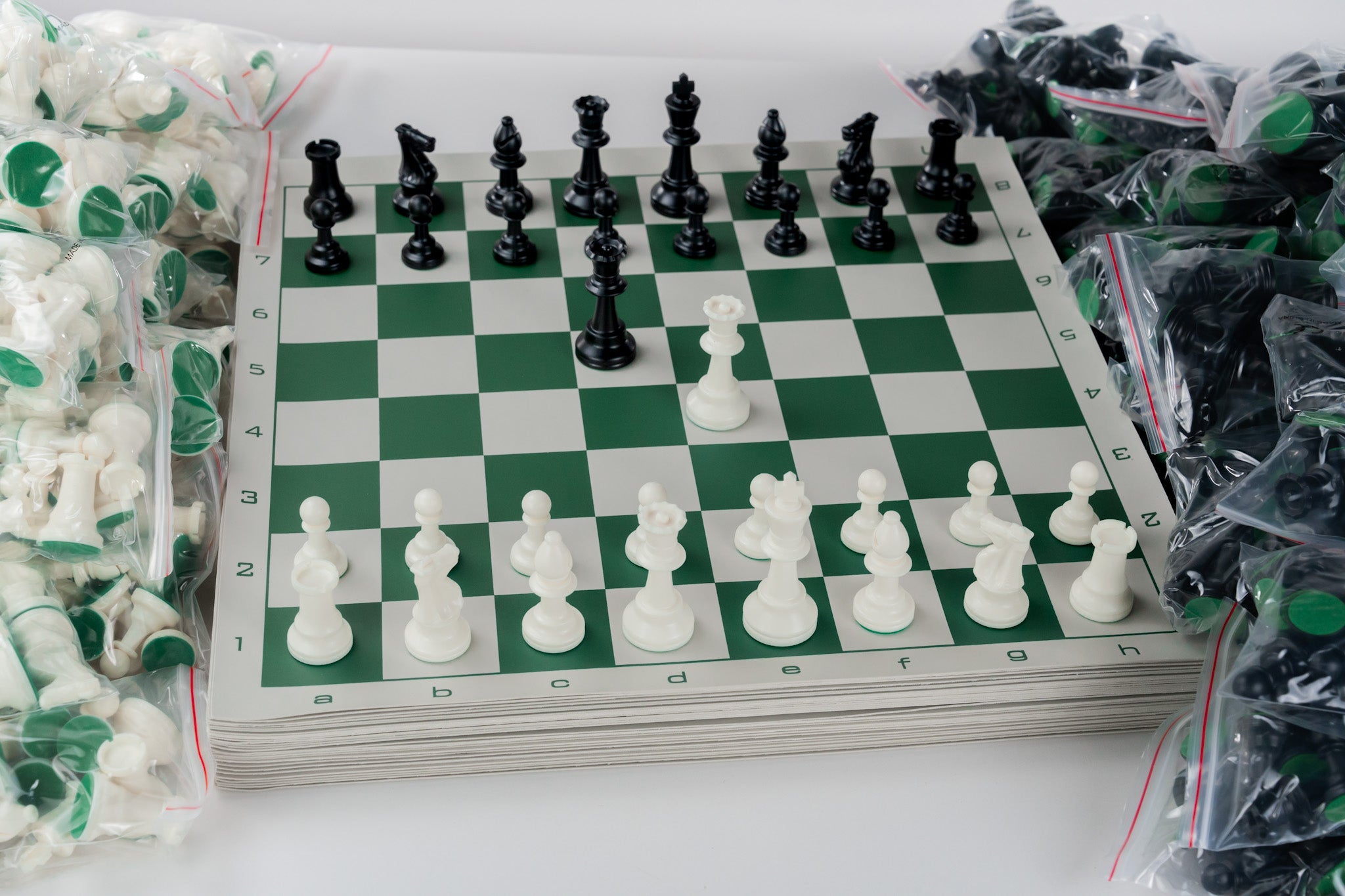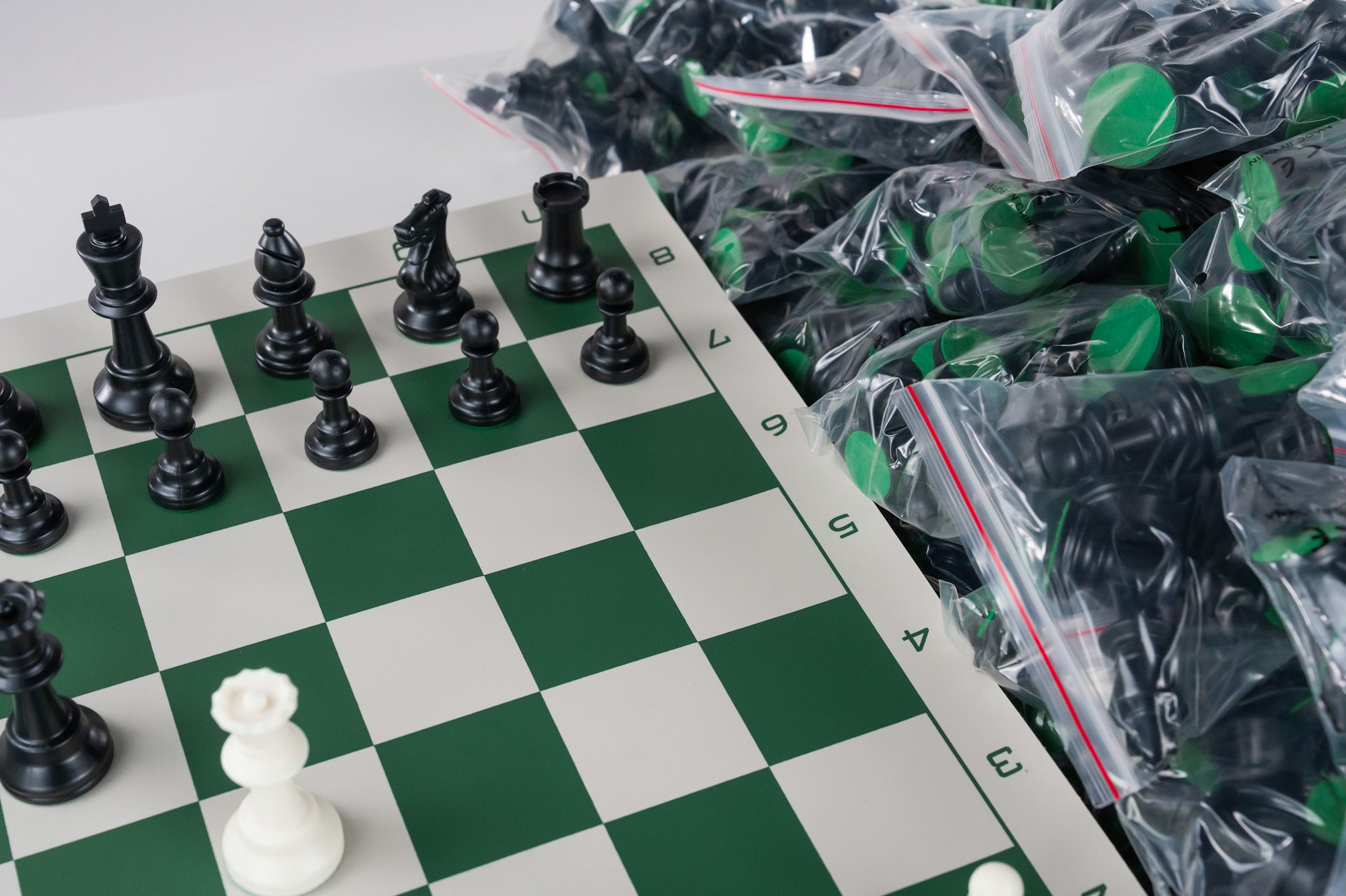 Our Budget Chess Set Packages for up to 80 players will equip your chess club with the basic chess sets and boards you need while keeping the cost down. We recommend the forest green chessboards as the best for students, as this color improves concentration and is easy on the eyes.