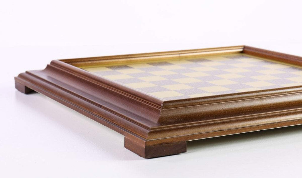The 14" Classic Pedestal Chessboard, a smaller version of the 20 1/2" Classic Pedestal Chessboard, features the same antique finished Italian worm-wood style frame with a solid Brass playing area. It is made in Italy.