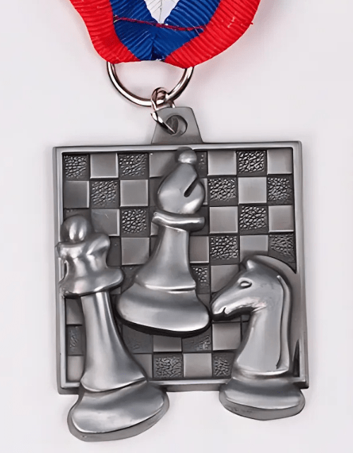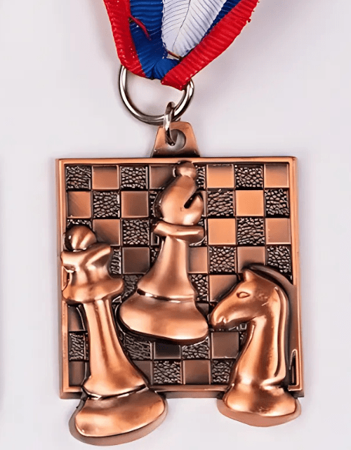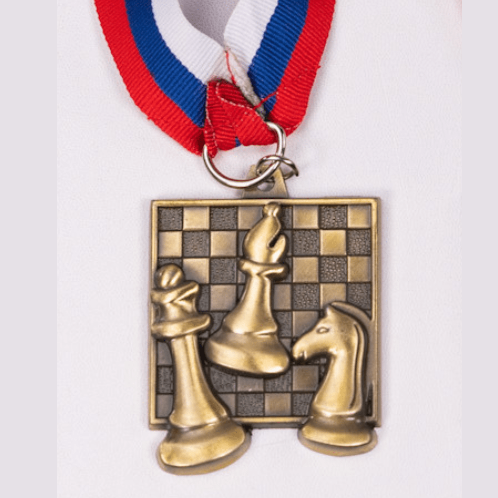 Gold, Silver, and Bronze colored medals are great chess tournament prizes. Each one has a red, white, and blue patriotic neck-hanging strap. Medals have engraving space on the back. Award them to your chess students!