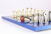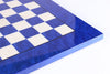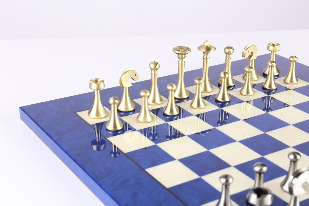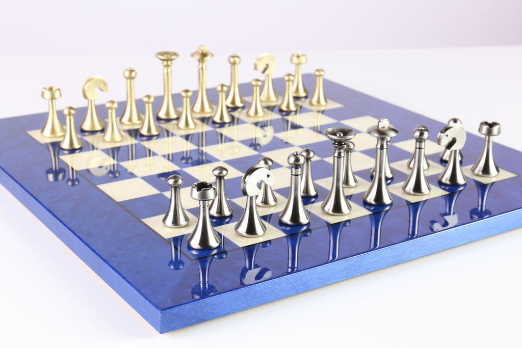 Add a splash of brilliant blue to any room with this eye catching Italian made Blue Briar Erable Veneer Wood chessboard and Contemporary Metal Chess Men combination.