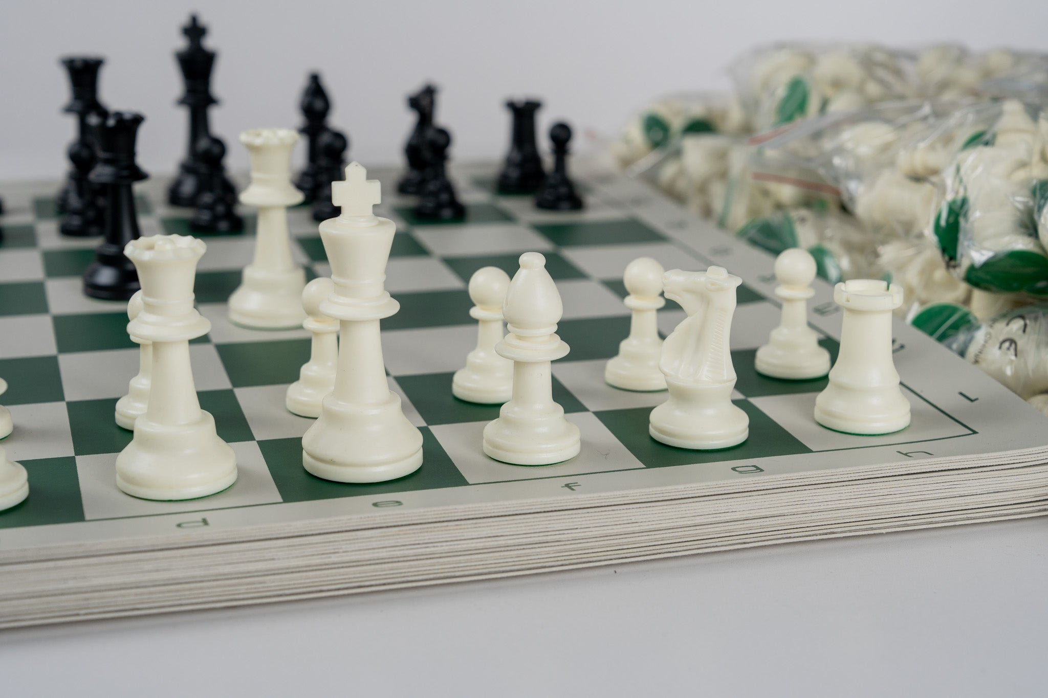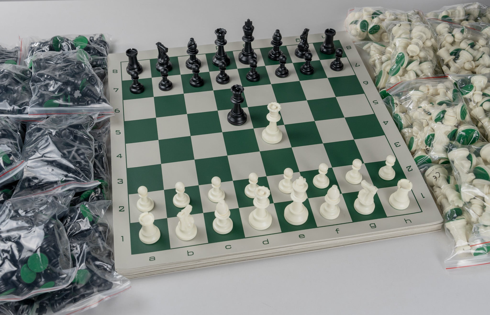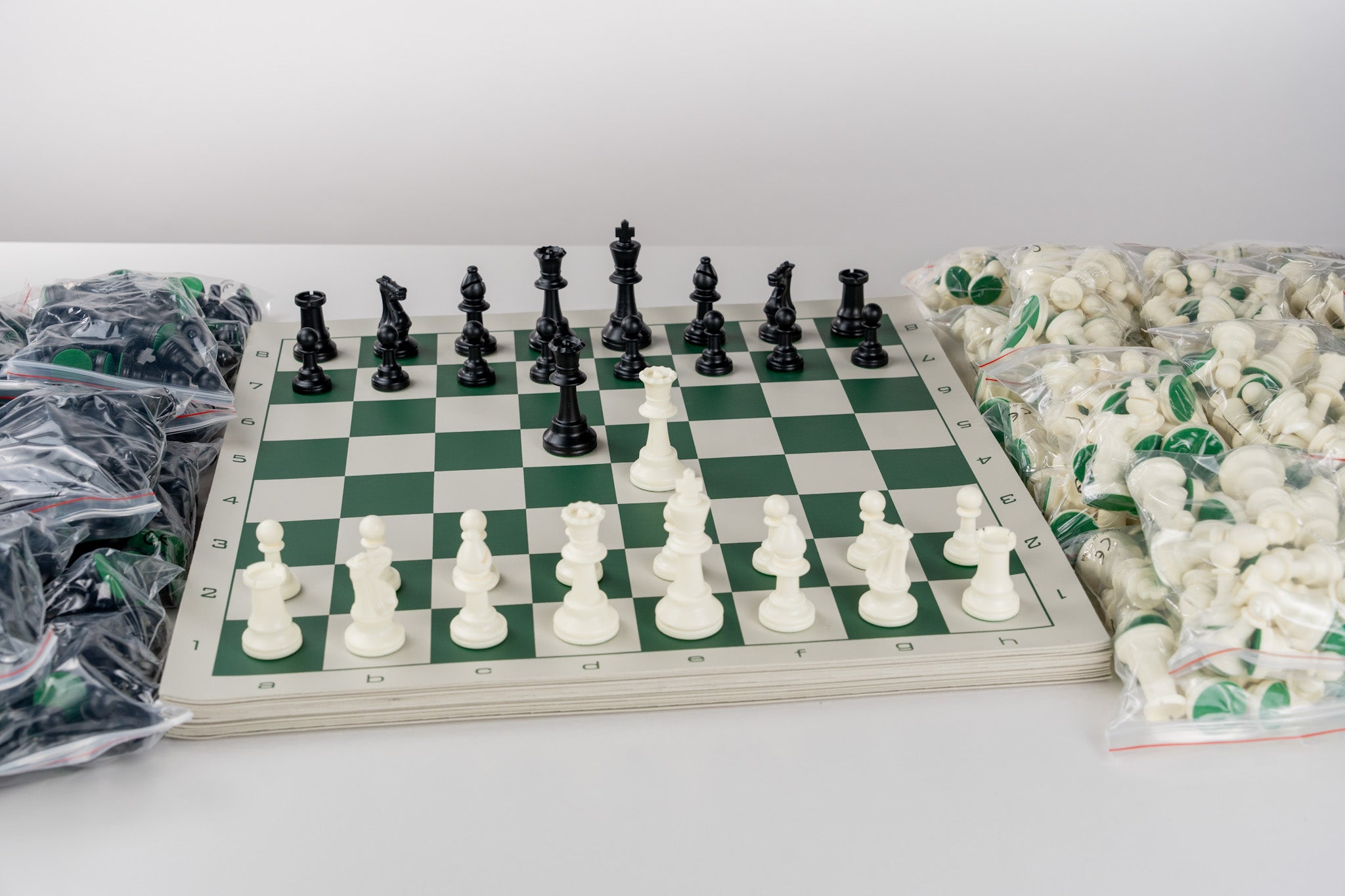 Our Deluxe Chess Sets Packages for up to 40 players equip your chess club with the Heavy-Weighted chess sets. We recommend the forest green chessboards as the best for students, as this color improves concentration and is easy on the eyes.