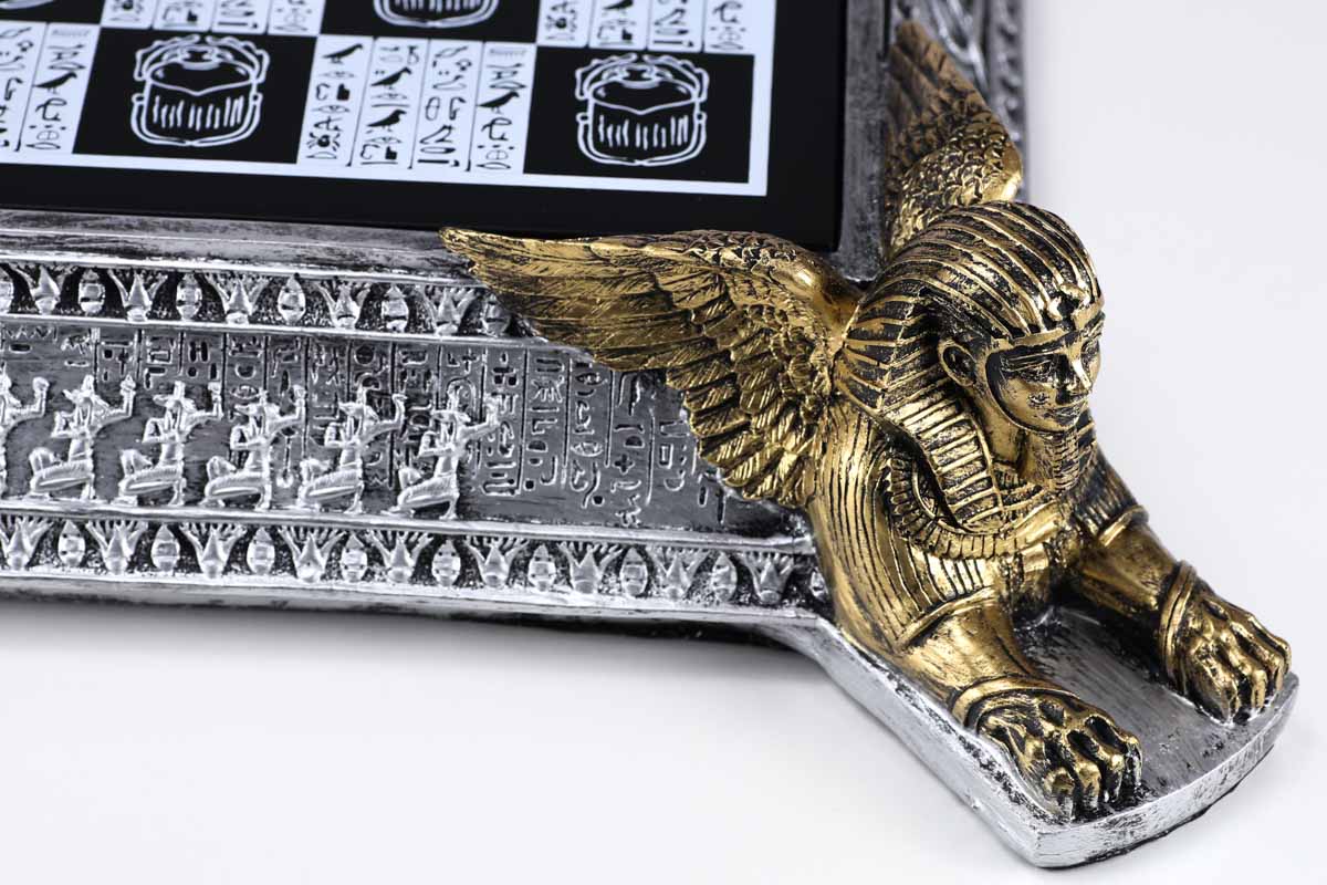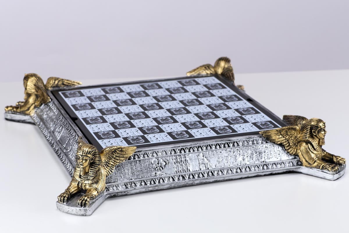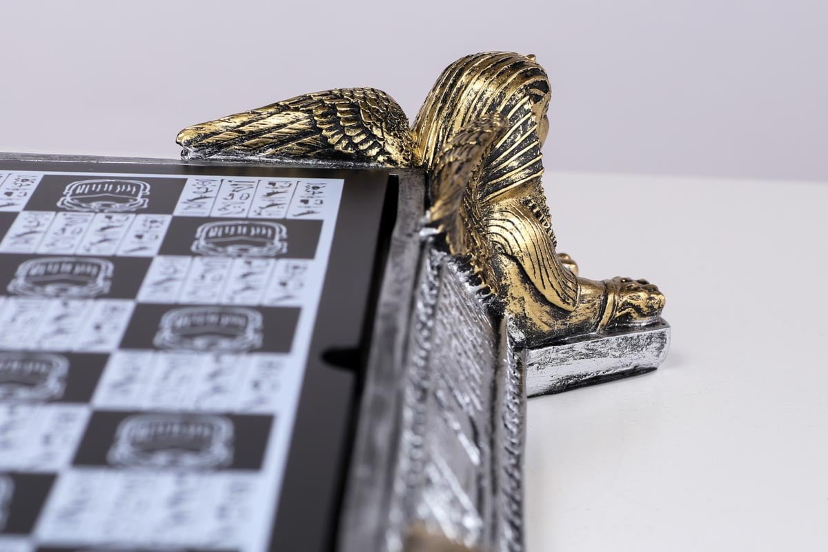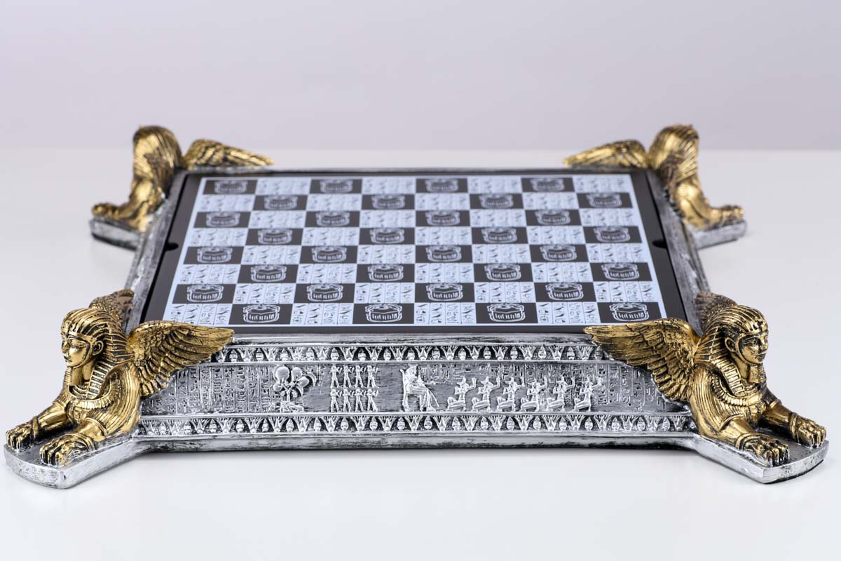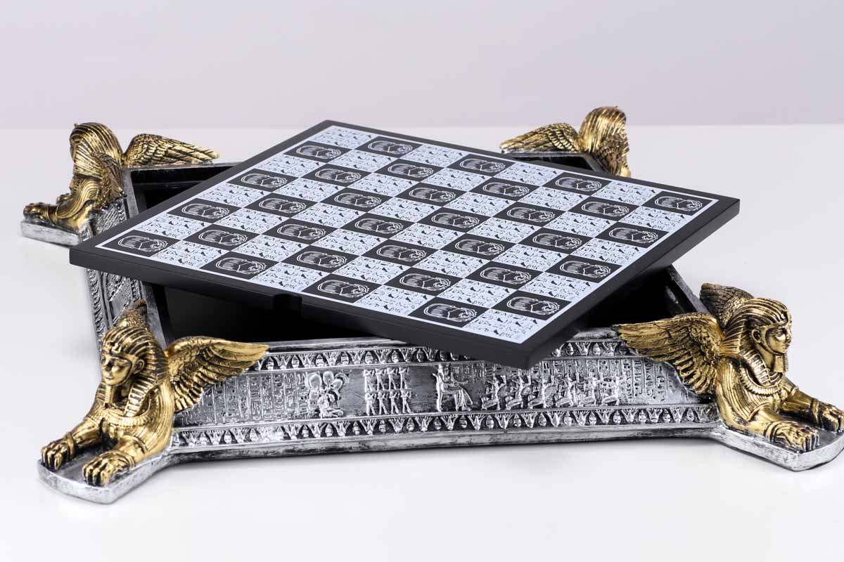 This is a beautifully decorated chessboard Egyptian themed chessboard. The board will transport you to another time in Egypt with its detailed Sphinx characters on each of the four corners. The board also has a convenient storage area for the chessmen.