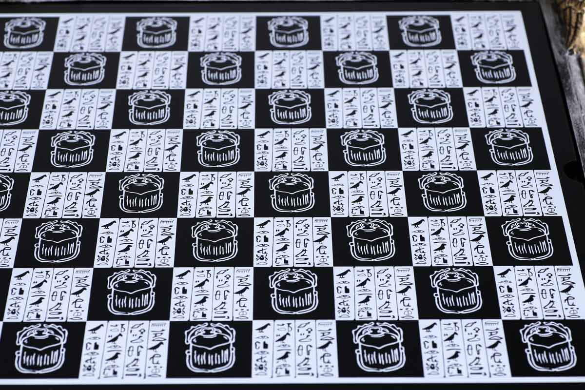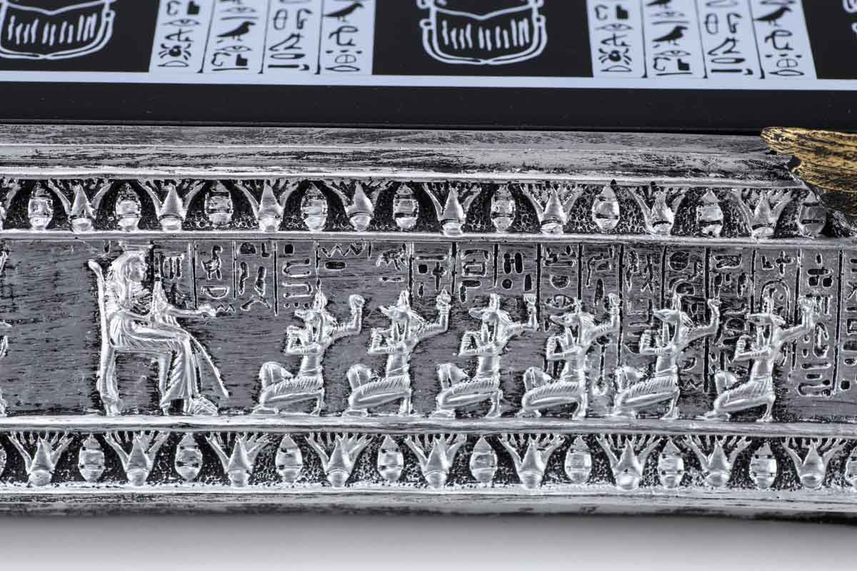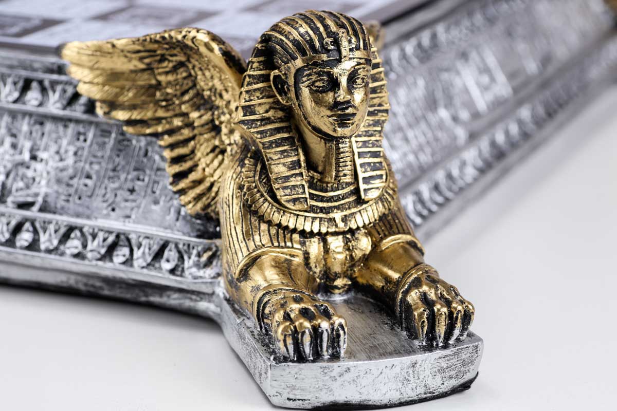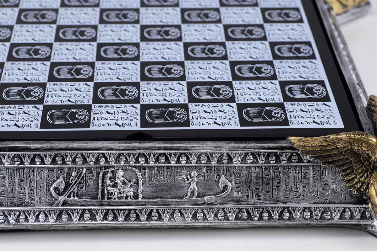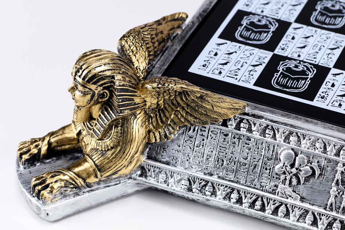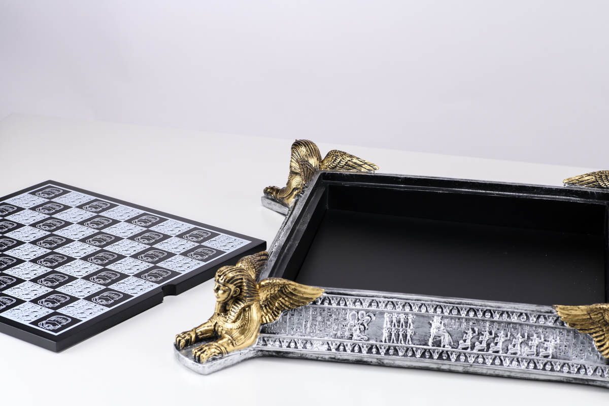 This is a beautifully decorated chessboard Egyptian themed chessboard. The board will transport you to another time in Egypt with its detailed Sphinx characters on each of the four corners. The board also has a convenient storage area for the chessmen.