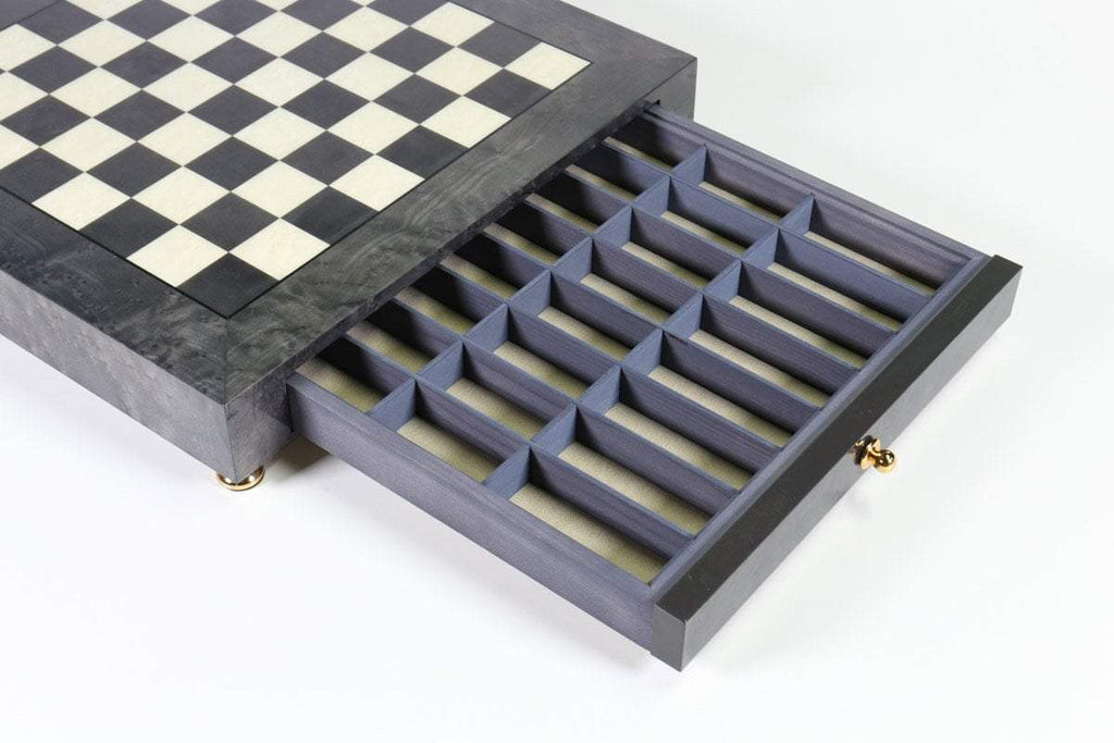 This wonderfully patterned glossy grey briarwood storage board has a silky shimmer similar to Birdseye maple that catches the eye. The drawer protects pieces when not in use, accommodating pieces up to 4" tall with 1 3/8" base.