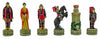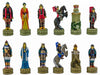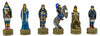 This set positions a color theme of red against blue. With the Shogun dressed to the 'T' in his armor and equipage, he looks the very picture of a champion Samurai. His wife at his side presents a splendid taste of Japanese women's dress from that era. The minor warlords, the bishops, are dressed quite well in their armor, and display various other features of Samurai weapons and accouterments. The leaping horse and his rider also demonstrate a little thought of aspect of warfare of the island--horsemen. A critical part of any army, a Samurai's horse was well-bred and wiry. The castle of the Shogun or ruler also depicts the famous pagoda style architecture of Feudal Japan; turned up roof corners, and many tiers to the building will indicate immediately where the building comes from. And, finally, the rank of pawns, in this case being the martial figures of Samurai soldiers. For the red side, the soldier is relaxing on one knee, holding the short sword close at hand. The blue 'pawns' are upright, calmly awaiting the onset of the conflict--but behind those calm features are keep eyes, a great mind, and a formidable warrior!