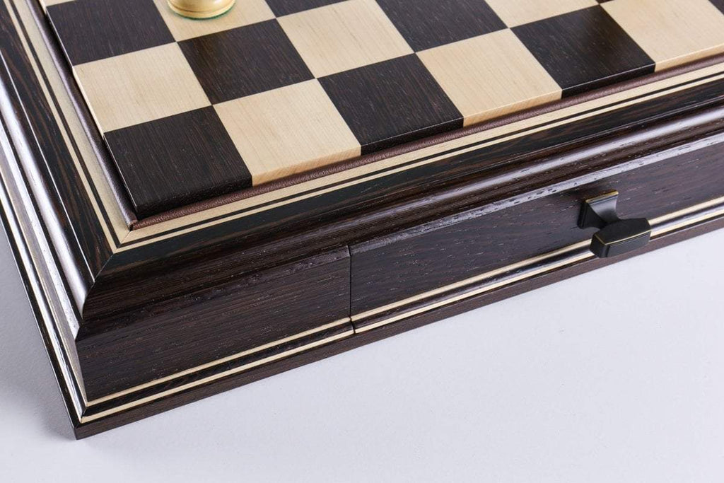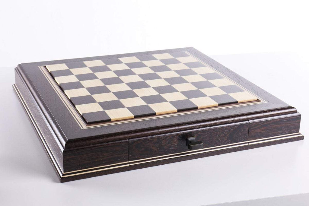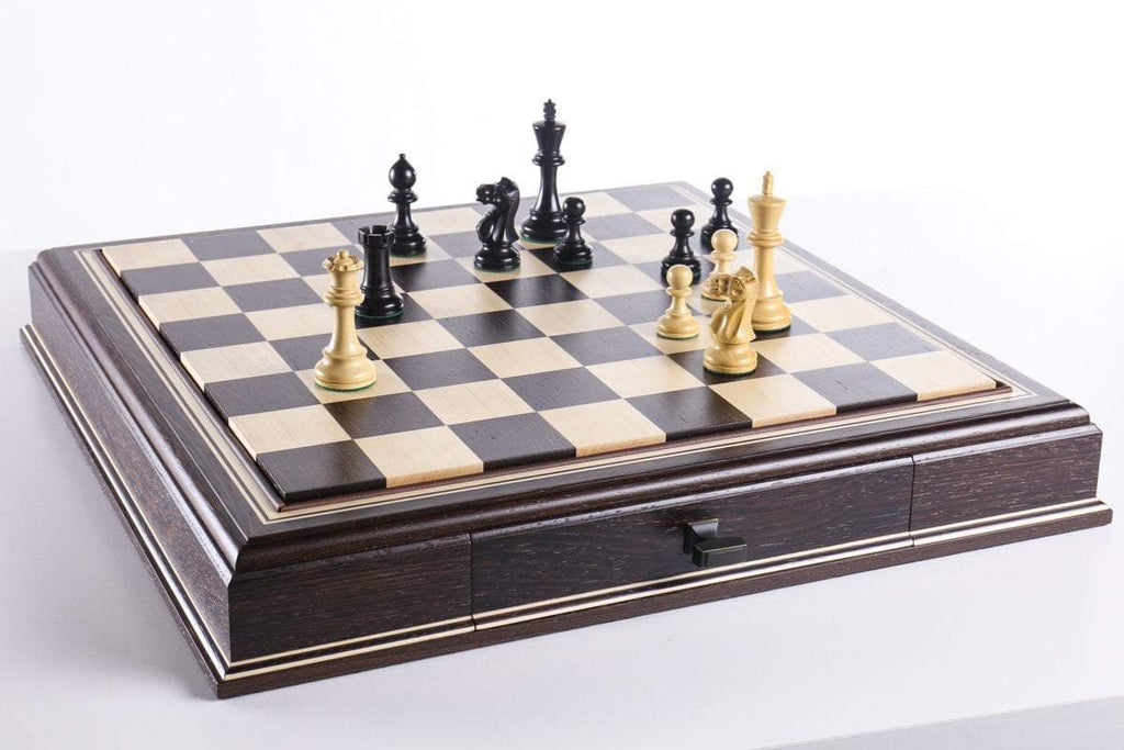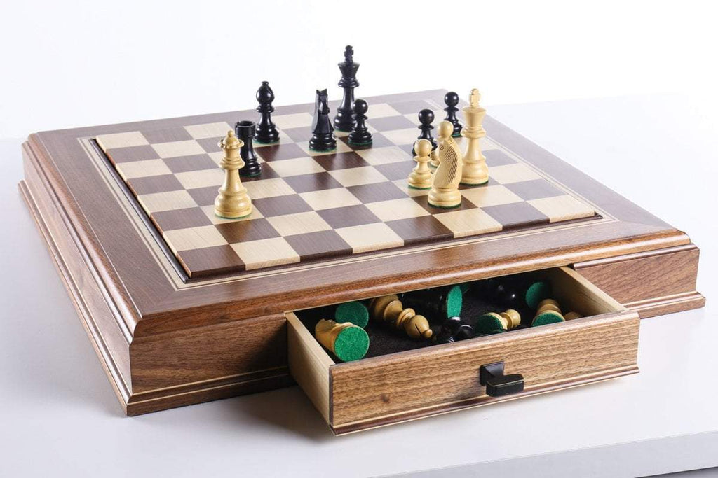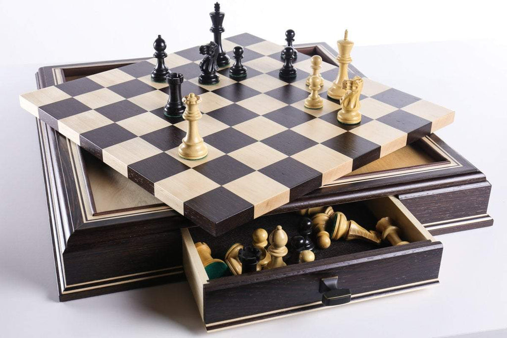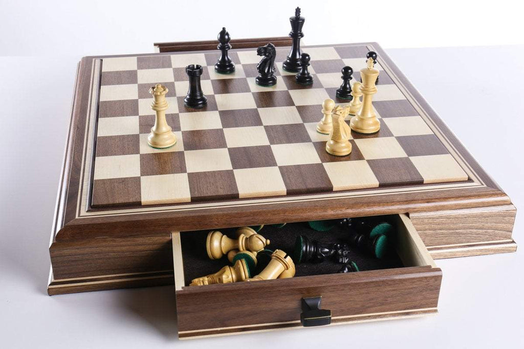 The JLP hardwood cabinet's storage drawers keep your chessmen safe and dust free, fitting any Staunton style chessmen appropriate to the chessboard square sizes of 2" or 2 1/4"