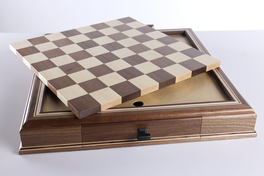 The JLP hardwood cabinet's storage drawers keep your chessmen safe and dust free, fitting any Staunton style chessmen appropriate to the chessboard square sizes of 2" or 2 1/4"