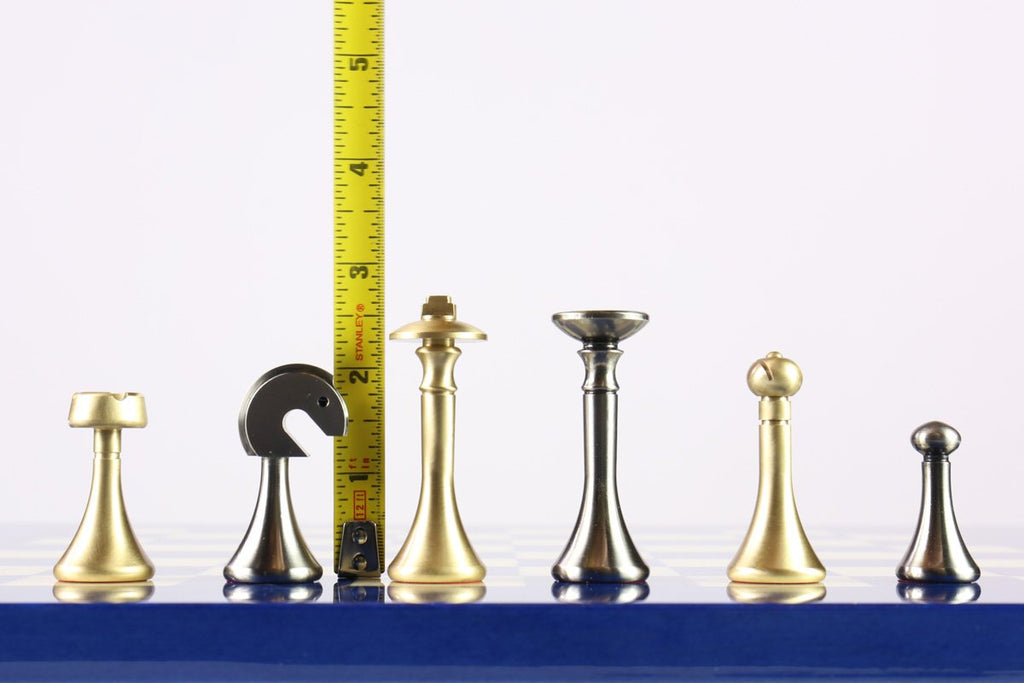 With a clean modern (yet 'futuristic') design, these hand finished, Italian made, 2 3/4" solid Brass & Nickel Plated Steel chessmen are well suited to impress guests while only taking up a "piccolo spazio" (small space).  These pieces work well on boards with a square size between 7/32" (1.22") and 1 3/8" (1.38"), though can still look amazing on a larger square when paired with the right board.