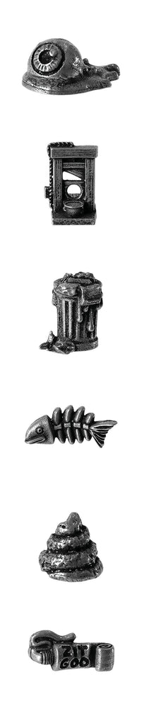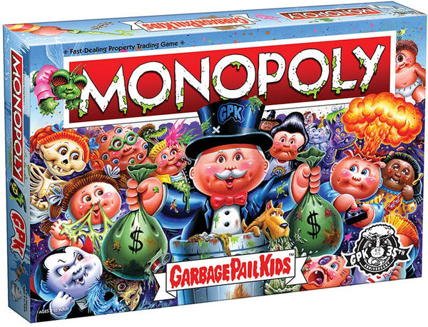 Relive the classic trading card game in a whole new way with MONOPOLY: Garbage Pail Kids. Featuring authentic licensed characters fans know and love. Collectible tokens include the Zit Goo Tube, Melting Eyeball, and Swirly Dog Poop as players move around the board to collect the iconic Garbage Pail Kids.