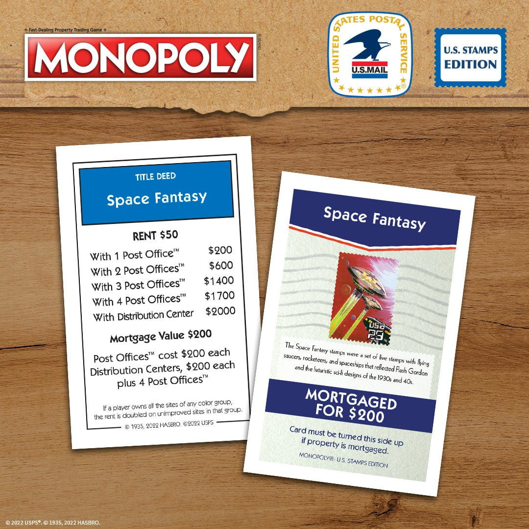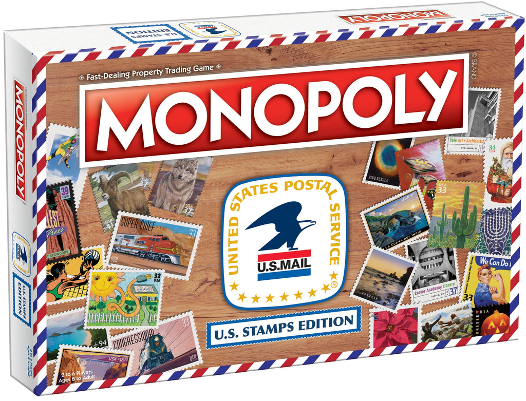 Celebrate a historical hobby enjoyed by philatelists around the world with a custom collection you can take out and play! Created in collaboration with USPS, MONOPOLY: U.S. Stamps Edition lets players buy, sell, and trade the most memorable stamps from U.S. history! Travel the board with USPS-inspired tokens such as a Mail Box, Roll of Stamps, Package and more to set up Post Offices and Distribution Centers. Keep your assets in superb condition to stick it to the competition and win!