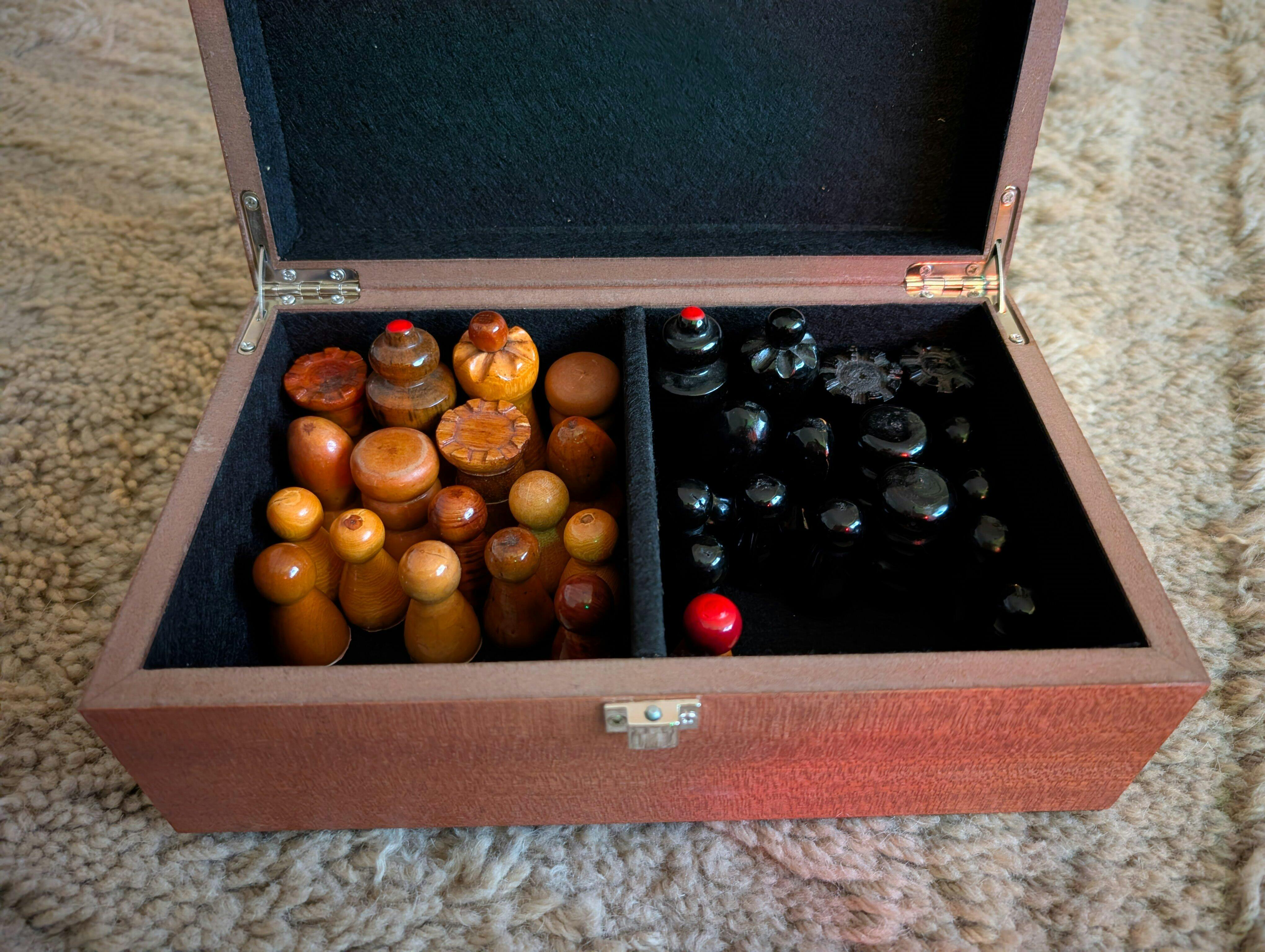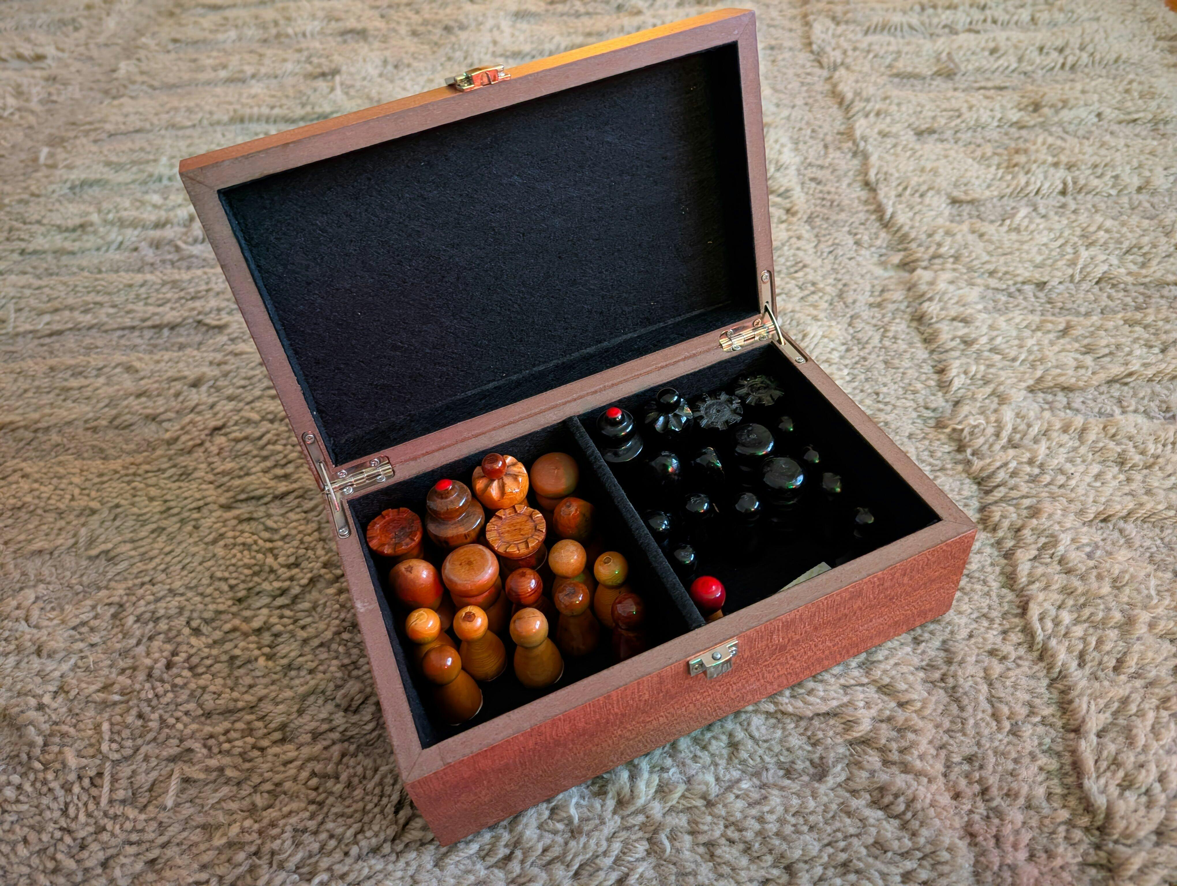 Safely store your wood chess pieces inside this sapele wood box, designed primarily for wooden chessmen with a king height of 3" to 3.75" tall. Even with extra queens, the box will be a good fit for the entire set.