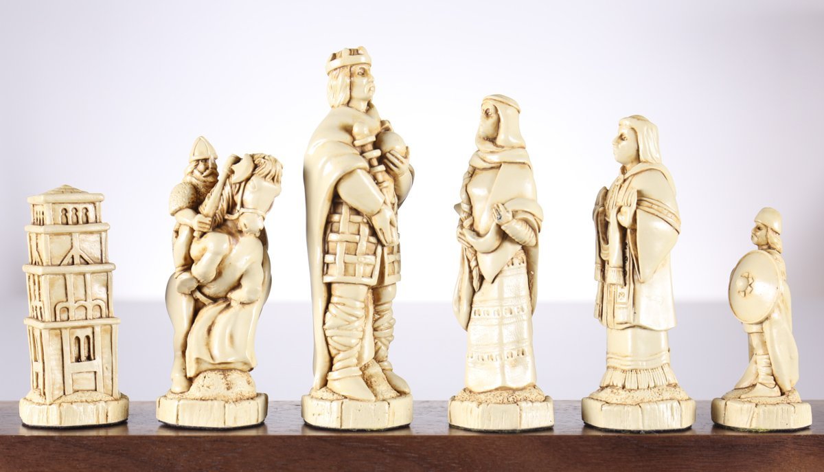The amazing detail created by our sculptors is richly displayed in this historic chess set. This superb set has been a favourite since its introduction in regular brown and ivory finish. It is Based on the famous Battle of Hastings in which King Harold II of England opposed the invading Norman army led by William Duke of Normandy on October 14th 1066. After the hard fought battle of Stamford Bridge in which he defeated and killed Harold Hardrada King of Norway who had invaded Northumbria, Harold and his Saxon Army marched from York to the south coast of England. At a small village just inland from Hastings, Harold's tired army met the invading forces of William Duke of Normandy.