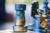 Alchemy Artist Sydney Gruber displays her talent on the chess board with the 20" Large King's Chess Set, a unique and attractive set that proves one of her most popular and interesting designs.
