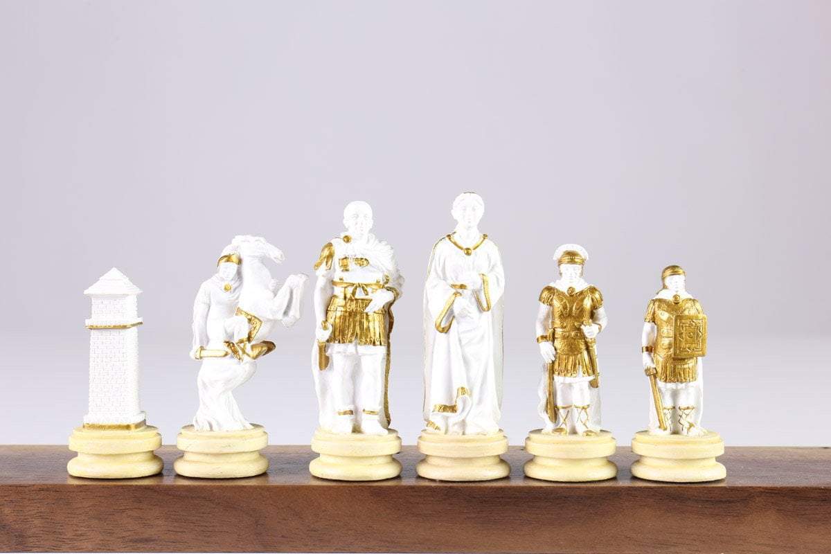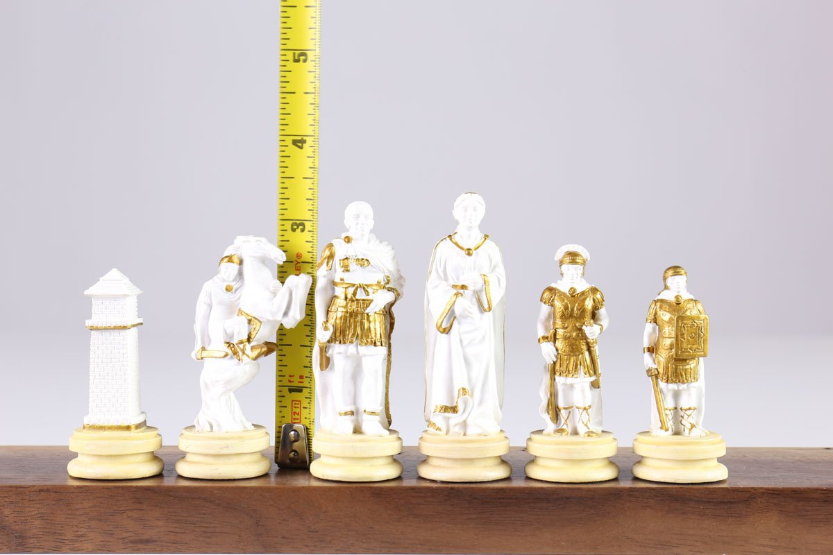 These Roman and Egyptian chessmen are made out of Polyresin, which is a crushed stone composite. It has the look and feel of stone, but the durability of a plastic, offering the best of both worlds. The pieces are highlighted with gold paint.